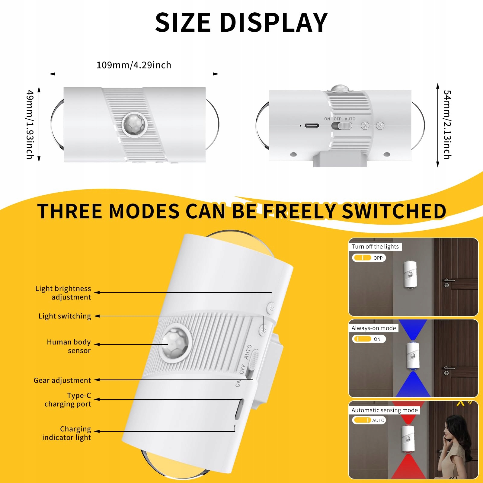 【Siedem efektów świetlnych do wyboru】Lampa z czujnikiem ruchu oferuje 7 stałych trybów kolorów, które można swobodnie ustawić za pomocą przycisku, z 4 poziomami jasności. Ta regulowana lampa ścienna do wnętrz pomaga stworzyć idealną atmosferę świetlną w każdym pomieszczeniu.