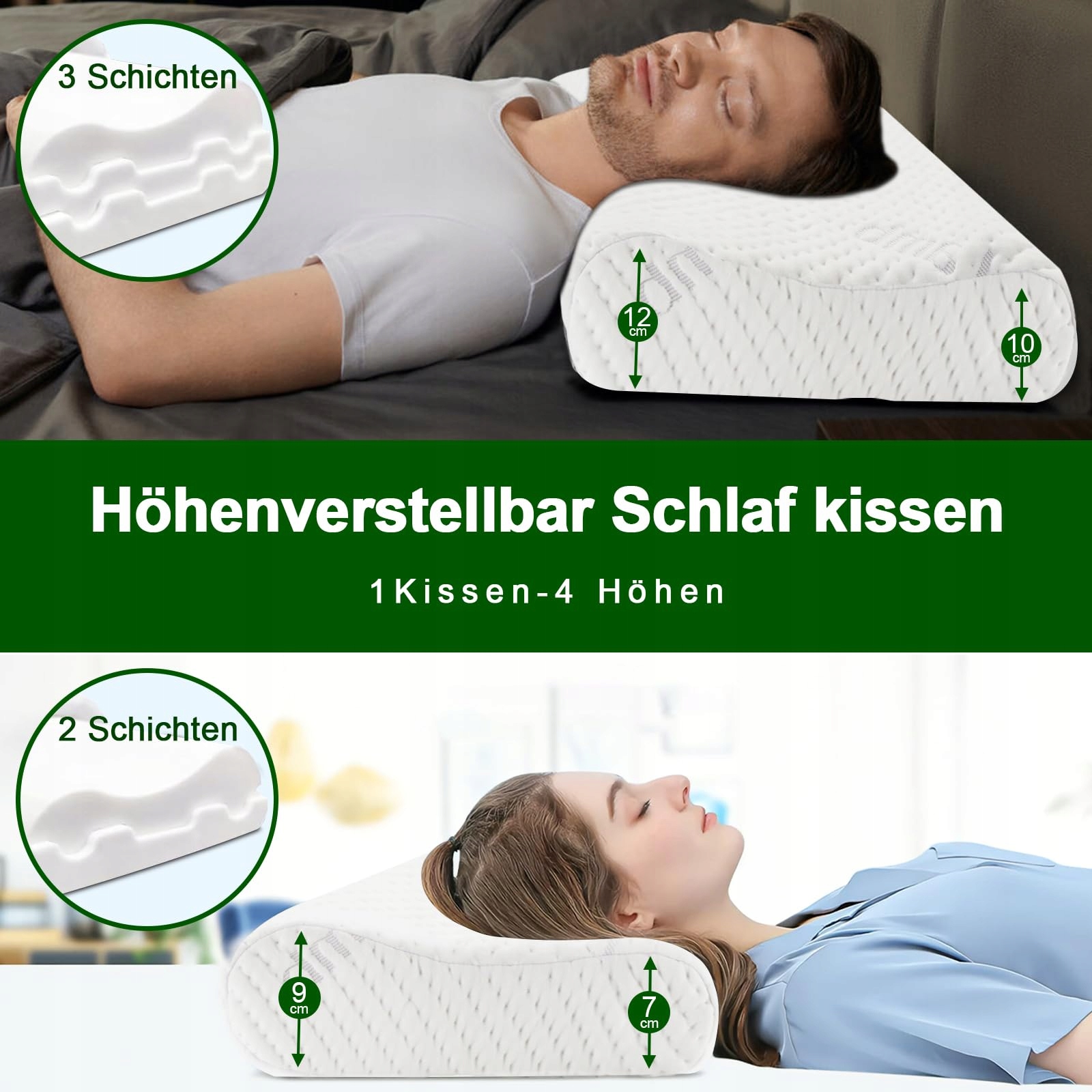 Regulowana wysokość: Poduszka ortopedyczna na szyję ma regulowaną wysokość, o pierwotnym rozmiarze 60 x 36 x 12/10 cm. Możesz łatwo dostosować wysokość do swoich potrzeb, usuwając środkową warstwę pianki. Umożliwia to wysokości 12 cm/10 cm lub 9 cm/7 cm, co pozwala na indywidualne dopasowanie i pomaga znaleźć idealną pozycję do snu.