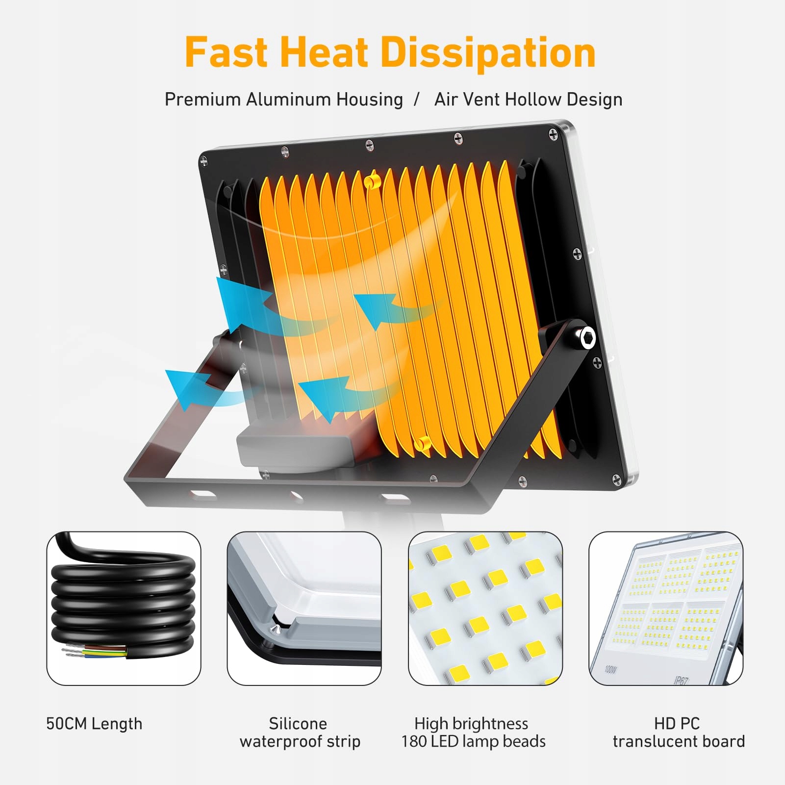 Wodoodporność IP67 i trwałość: Reflektor LED z czujnikiem ruchu na zewnątrz jest całkowicie uszczelniony i spełnia klasę ochrony IP67. Działa stabilnie nawet podczas silnego deszczu i śniegu. Aluminiowa tylna obudowa klasy lotniczej jest nie tylko solidna i trwała, ale także szybko odprowadza ciepło, wydłużając żywotność, można go bezpiecznie stosować zarówno wewnątrz, jak i na zewnątrz
