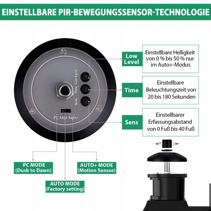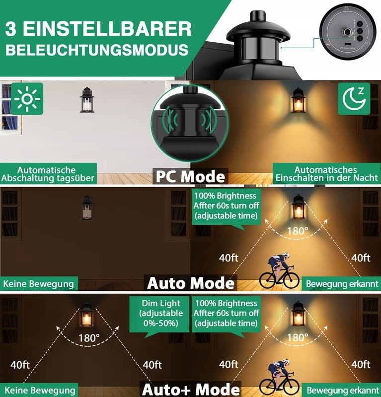 【Regulowane zewnętrzne lampy z czujnikiem ruchu PIR】 z 3 trybami oświetlenia (PC, Auto, Auto+) do wyboru. Możesz ustawić zasięg czujnika ruchu (0–12 m), czas świecenia (20 s–180 s) oraz jasność przyciemnionego światła od 0% do 50% (tylko w trybie Auto+). Ta innowacyjna technologia spełnia różnorodne wymagania i zwiększa satysfakcję użytkownika, co upraszcza użytkowanie.