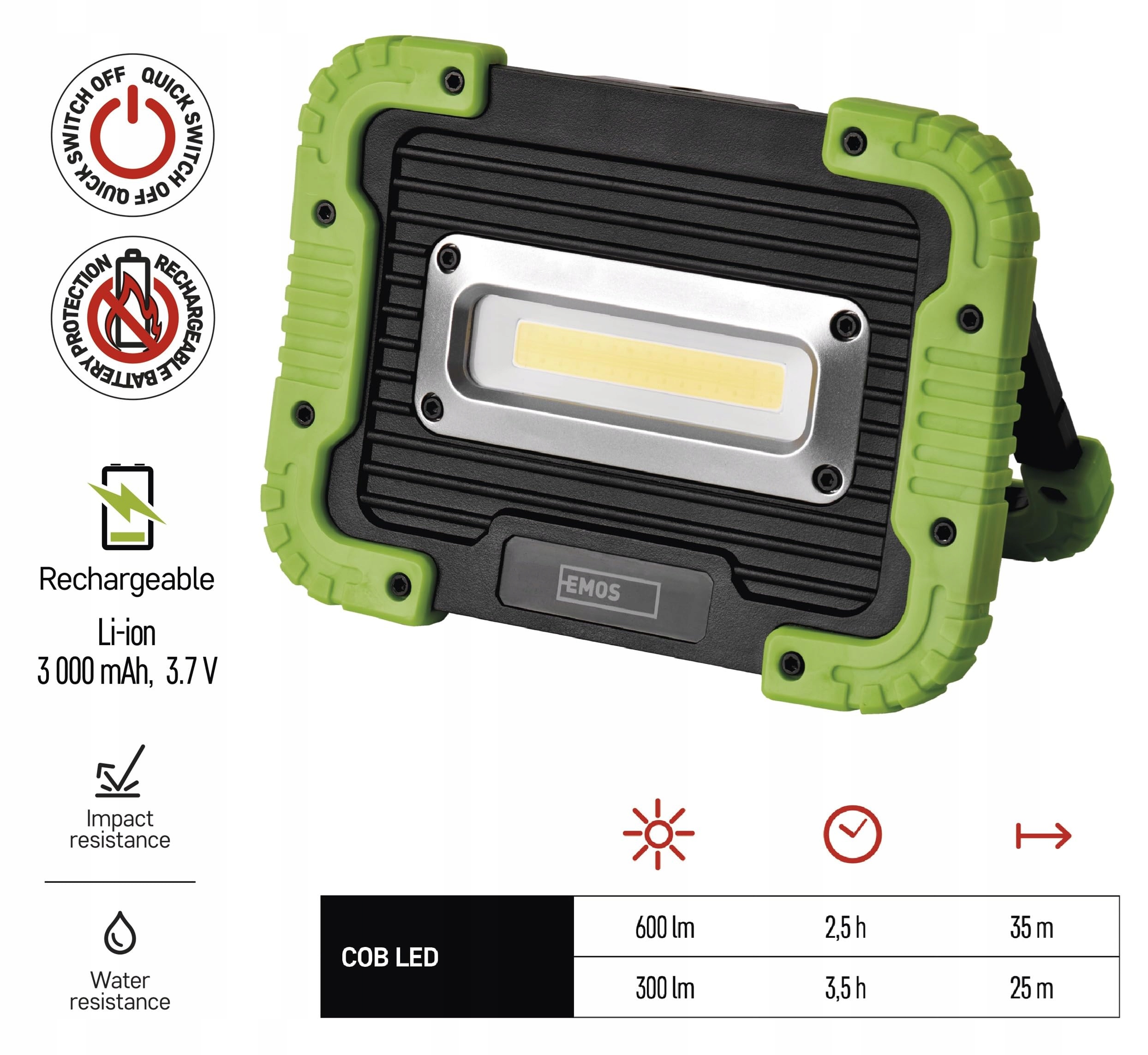 JASNE I MOCNE: Uniwersalne światło robocze dzięki technologii COB-LED ma jasność do 600lm i zasięg świecenia do 35m. Dostępne są 2 różne tryby świecenia: COB LED 100%, COB LED 50%. (EMOS P4534)