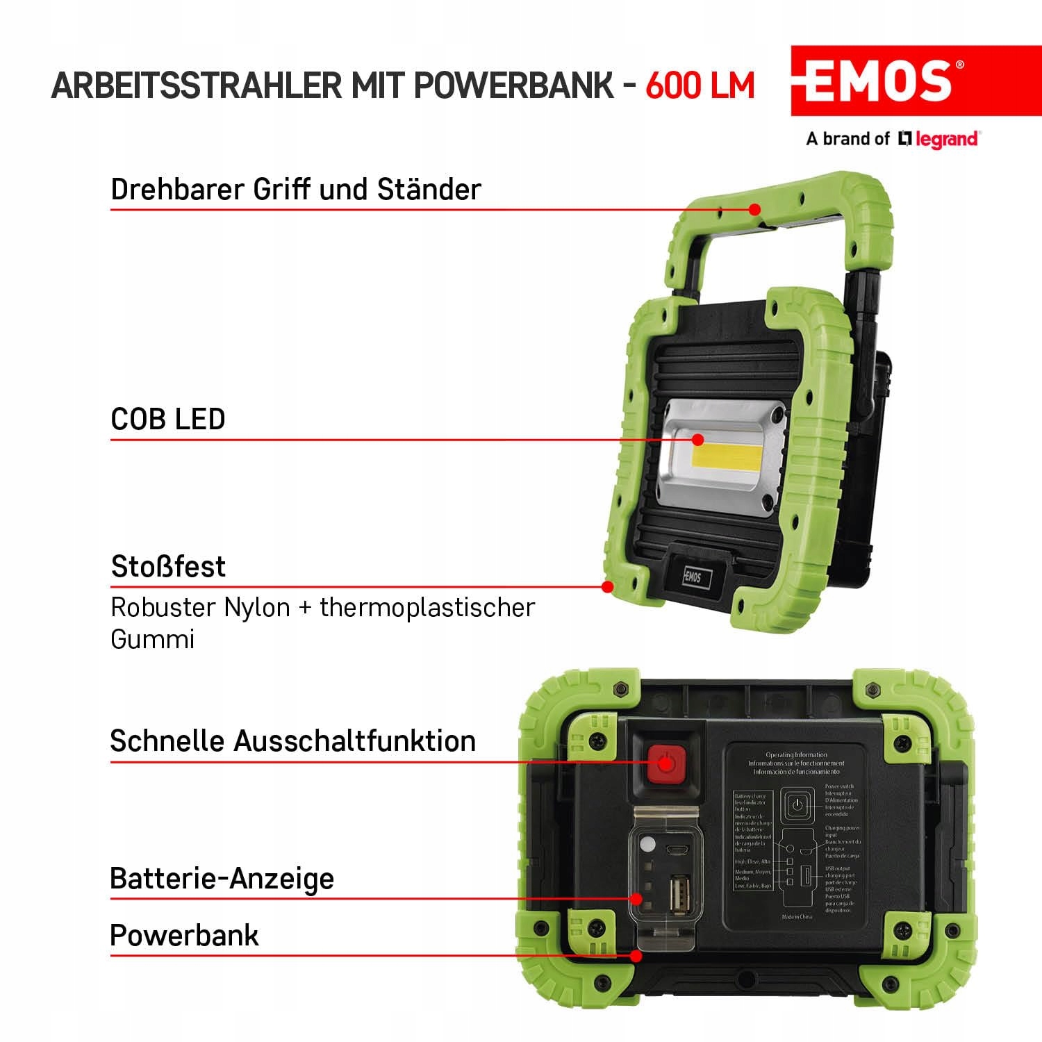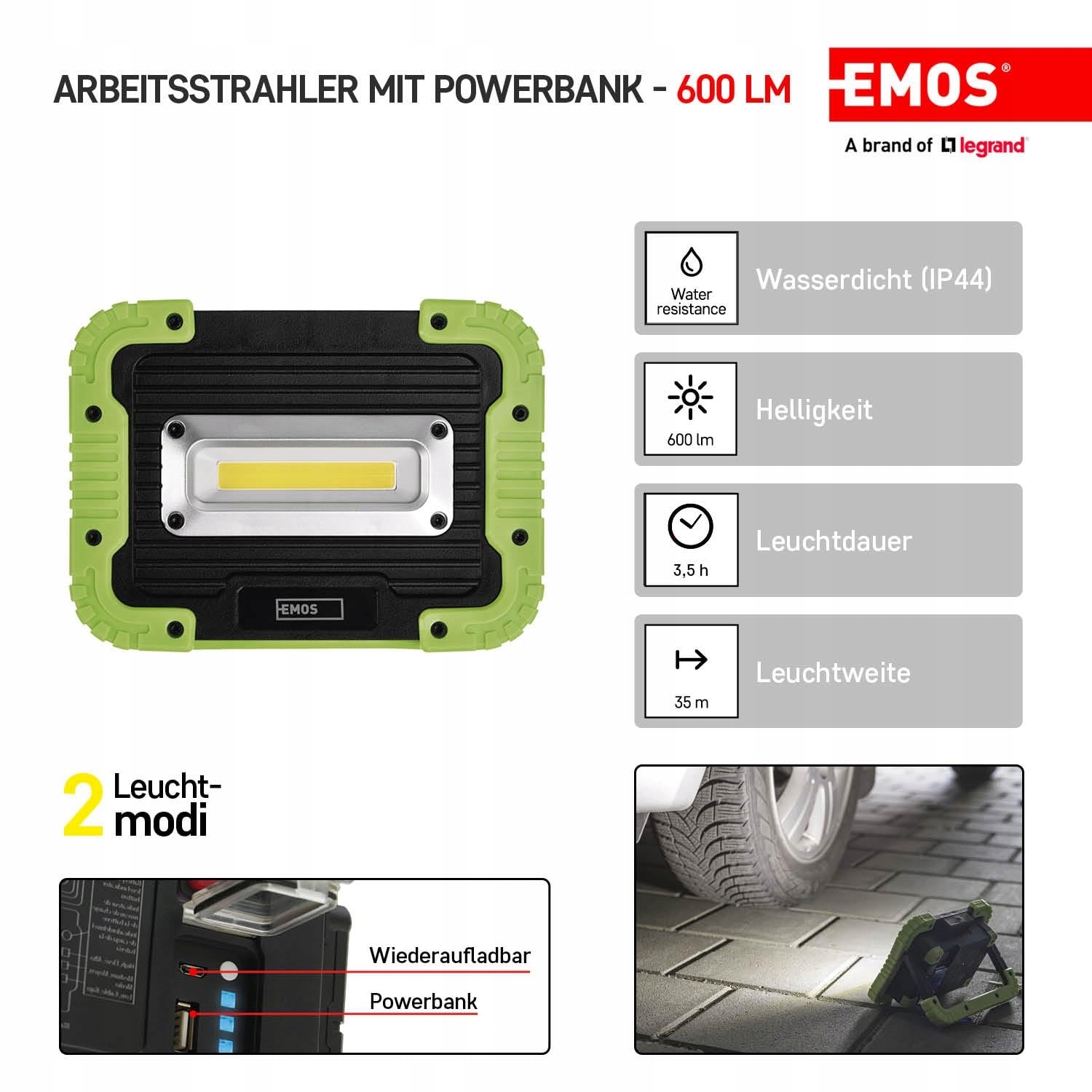 LED-Latarka robocza, ładowalna lampa kempingowa z powerbankiem, wodoodporny przenośny reflektor LED, 600 lm, zasięg świecenia 35 m, akumulator 3000 mAh z czasem świecenia 3,5 godz. i kablem USB, P4534