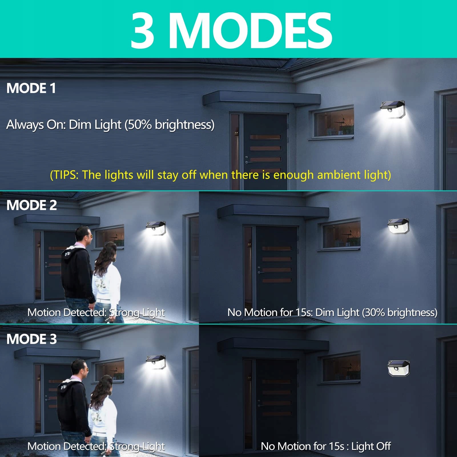 💡[Trzy tryby]: Korpus lampy tych zewnętrznych solarlamp posiada czujnik ruchu, podczas gdy panel solarny jest wyposażony w czujnik światła otoczenia. Możesz zmieniać tryb za pomocą wbudowanego przycisku lampy zewnętrznej: 1. Stałe światło; 2. Mocne światło przy ruchu, słabe światło bez ruchu; 3. Mocne światło przy ruchu, wyłączone bez ruchu.