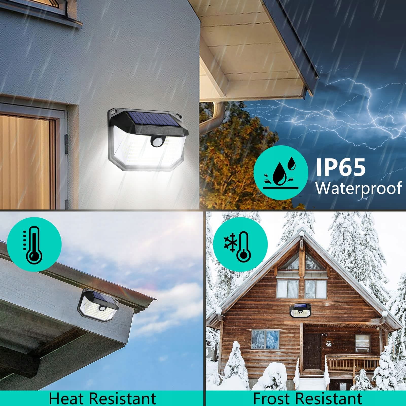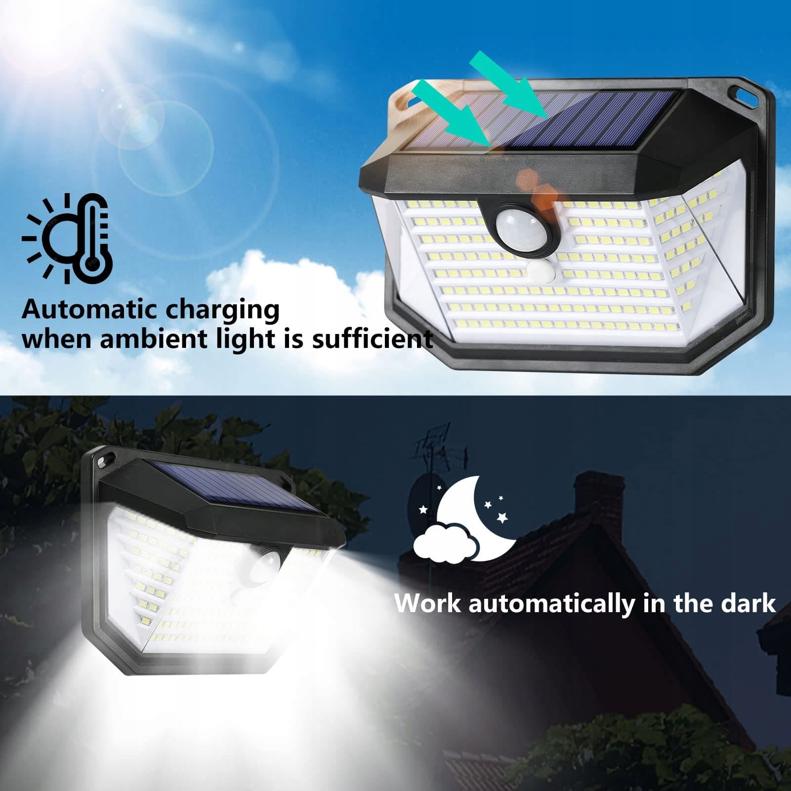 �[178 diod LED i kąt świecenia 270°]: Te solarlampy do użytku zewnętrznego z czujnikiem ruchu wykorzystują 178 wysokiej jakości diod LED, które zapewniają wyższą gęstość lumenów dla Twojego ogrodu i sprawiają, że jasność światła jest bardziej jednolita. Okna lamp są rozmieszczone w trzech kierunkach, aby zapewnić, że światło solarlamp osiąga kąt 270 stopni.