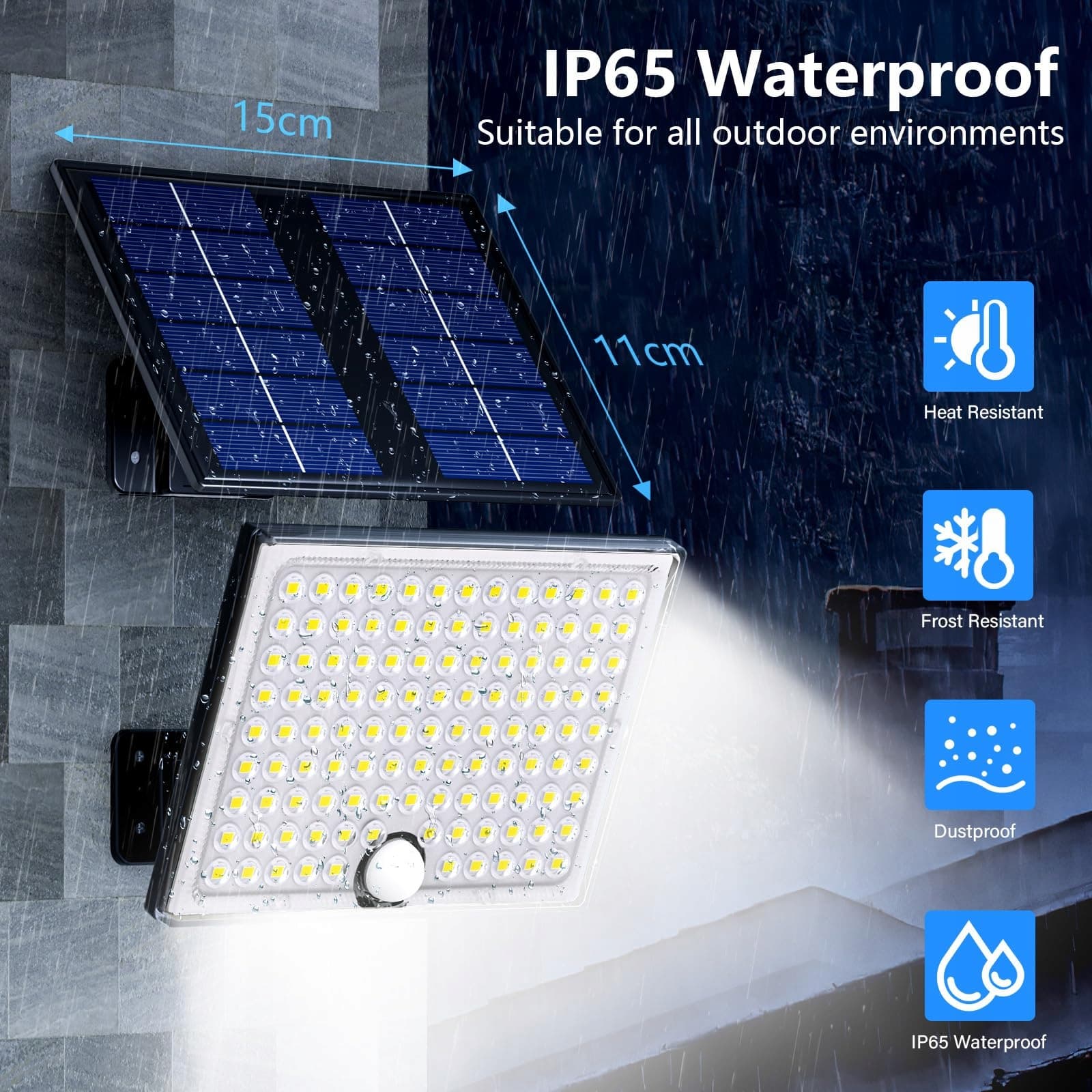 Wodoszczelna i odporna na wysokie temperatury konstrukcja – dłuższa żywotność - solarna lampa ścienna jest wykonana z wysokiej jakości tworzywa ABS, który wytrzymuje różne trudne warunki pogodowe na świeżym powietrzu. Profesjonalny poziom ochrony IP65, lampa solarna jest wewnątrz odporna na wodę i kurz oraz może utrzymać bardzo jasną jasność, nawet jeśli jest wystawiona na działanie dłuższego czasu na zewnątrz.