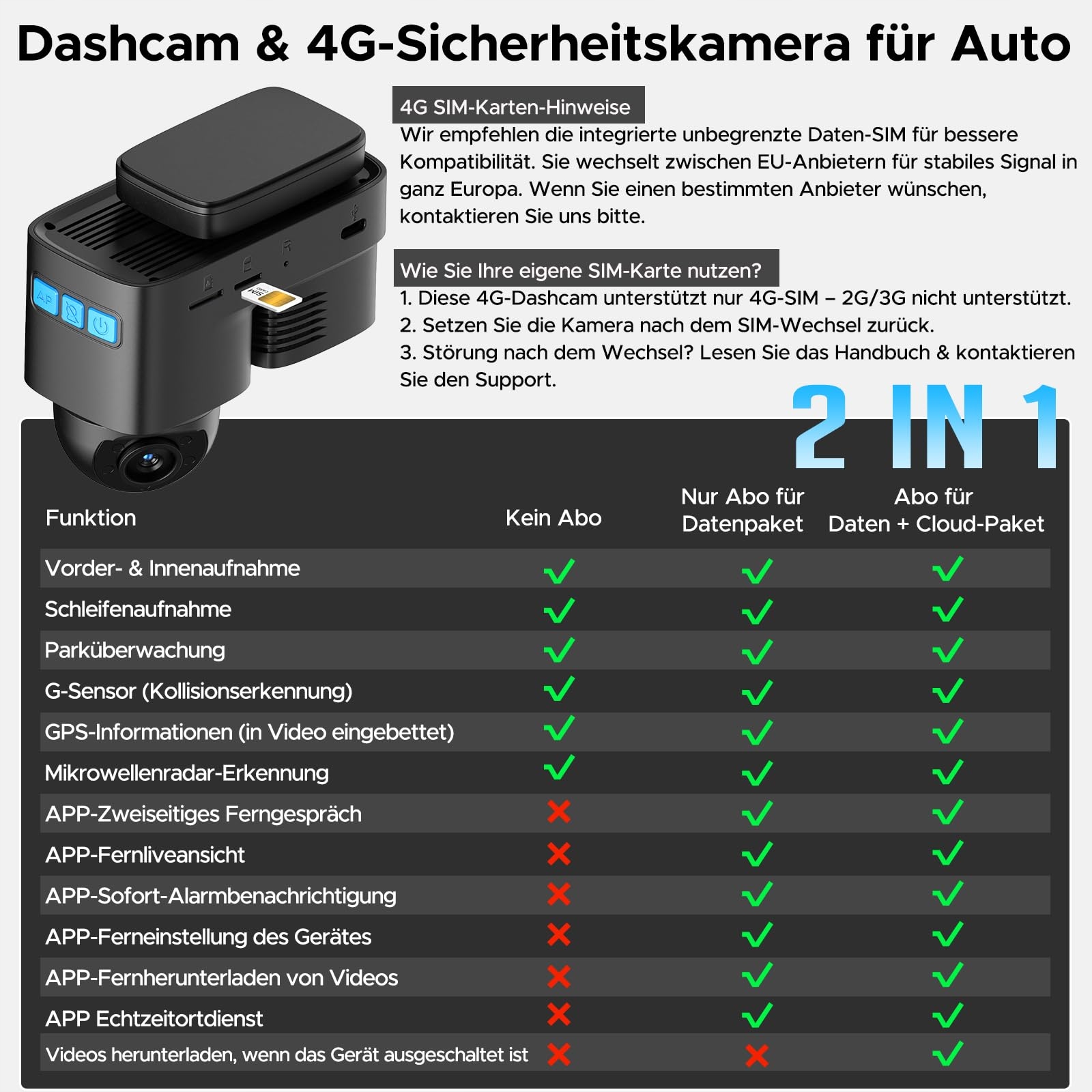 【Wbudowana karta SIM 4G / wymienna】Kamera bezpieczeństwa samochodu jest dostarczana z kartą SD i 7 dniami nieograniczonego testowego pakietu danych. Po okresie próbnym możesz wykupić subskrypcję przez aplikację: 12,90 €/miesiąc (0,43 €/dzień), 59,90 €/6 miesięcy, 99,90 €/rok (0,27 €/dzień). Kamera samochodowa 4G obsługuje operatorów sieci komórkowych UE dla stabilnego sygnału i umożliwia nieograniczony transfer danych. Możesz używać własnej karty SIM 4G do funkcji zdalnych bez konieczności korzystania z naszego pakietu danych. Brak 2G/3G.