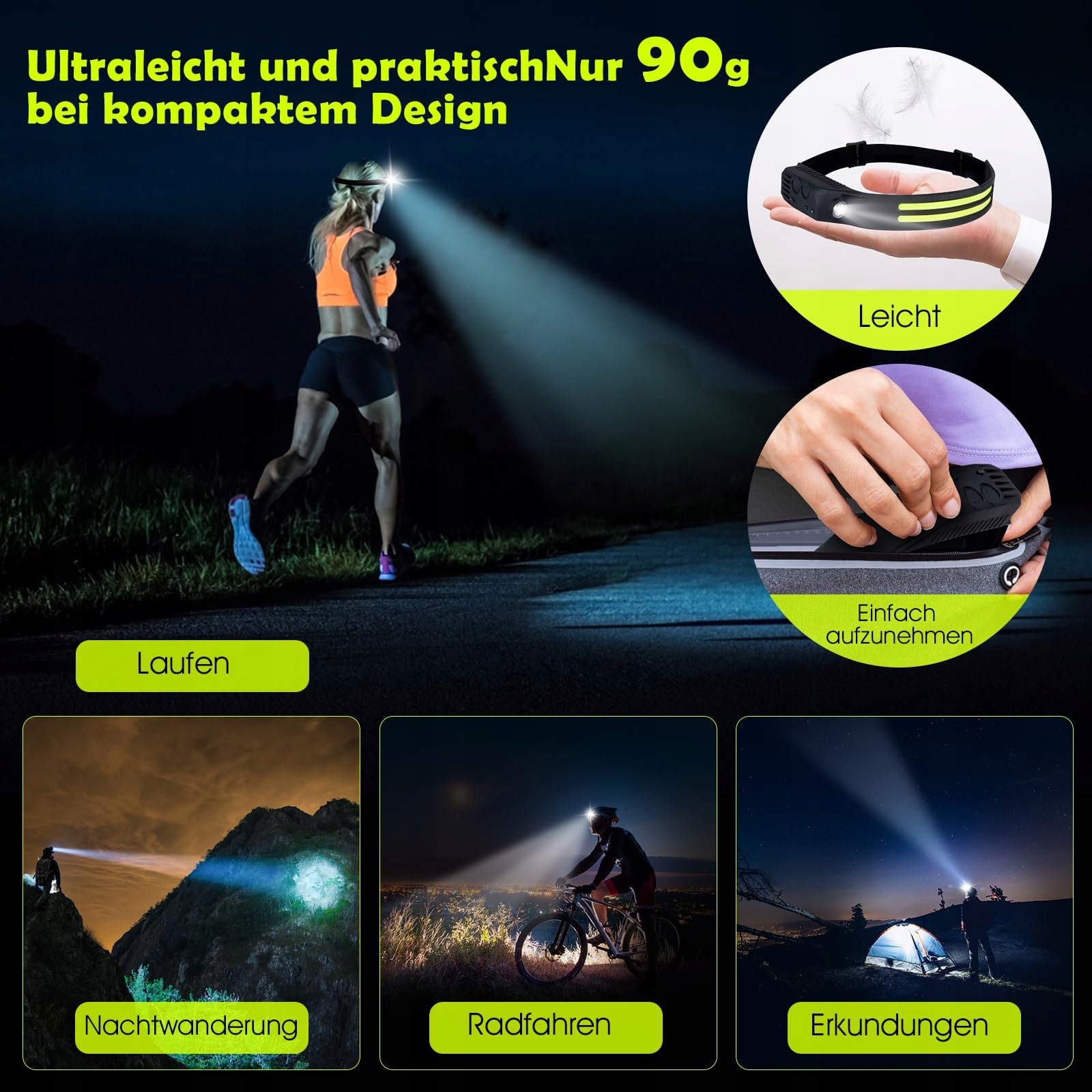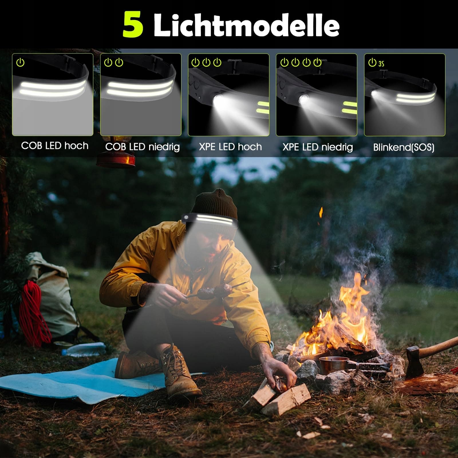 【5 trybów światła & wodoodporna】Latarka czołowa LED ma 5 trybów jasności, aby spełnić Twoje codzienne potrzeby. COB-LED wysoki, COB-LED niski, XPE-LED wysoki, XPE-LED niski, tryb stroboskopowy COB-LED i XPE-LED (przytrzymaj i naciśnij przycisk ON/OFF przez 3s, aby przełączyć się w tryb stroboskopowy), wodoodporność IPX4.