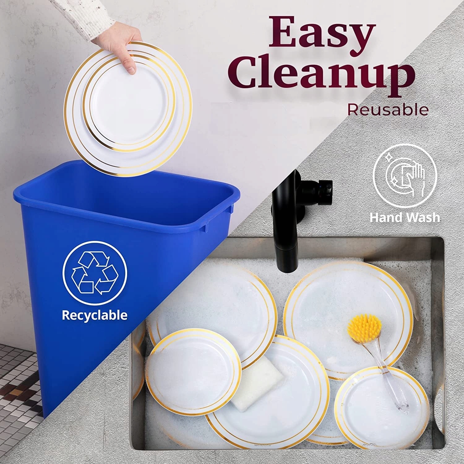 [Wielorazowe] Ułatwiają szybkie sprzątanie po imprezie, oszczędzają czas i są przyjazne dla środowiska, łatwe do mycia mydłem i ciepłą wodą oraz suszenia, można je układać w stos, nie nadają się do mycia w zmywarce, mikrofalówki ani piekarnika