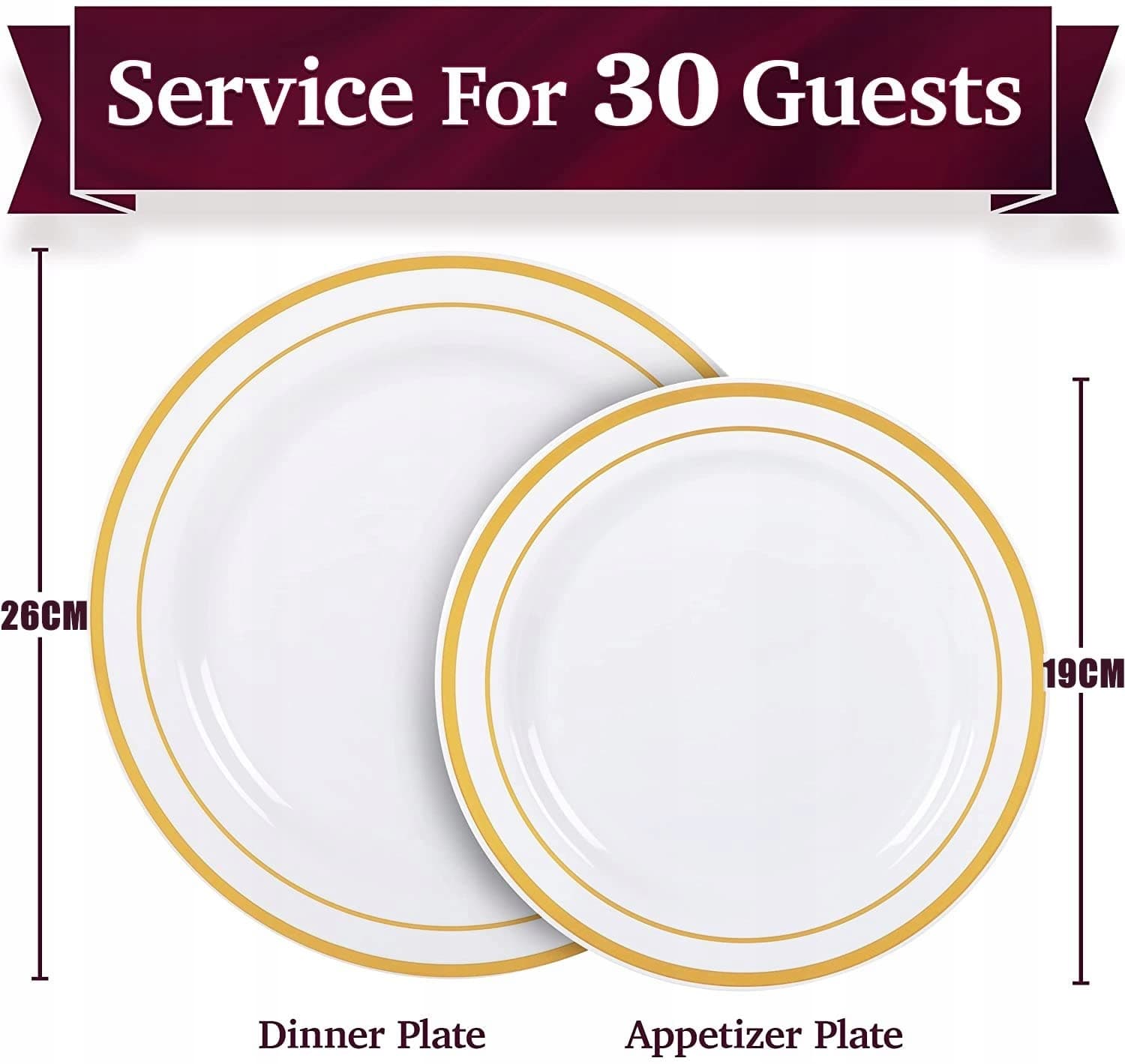 [Rozmiar] 30 talerzy obiadowych: 26 cm, 30 talerzy sałatkowych: 19 cm. Te talerze obiadowe ze złotym brzegiem idealnie pasują do innych złotych sztućców, złotych plastikowych kieliszków i złotych serwetek