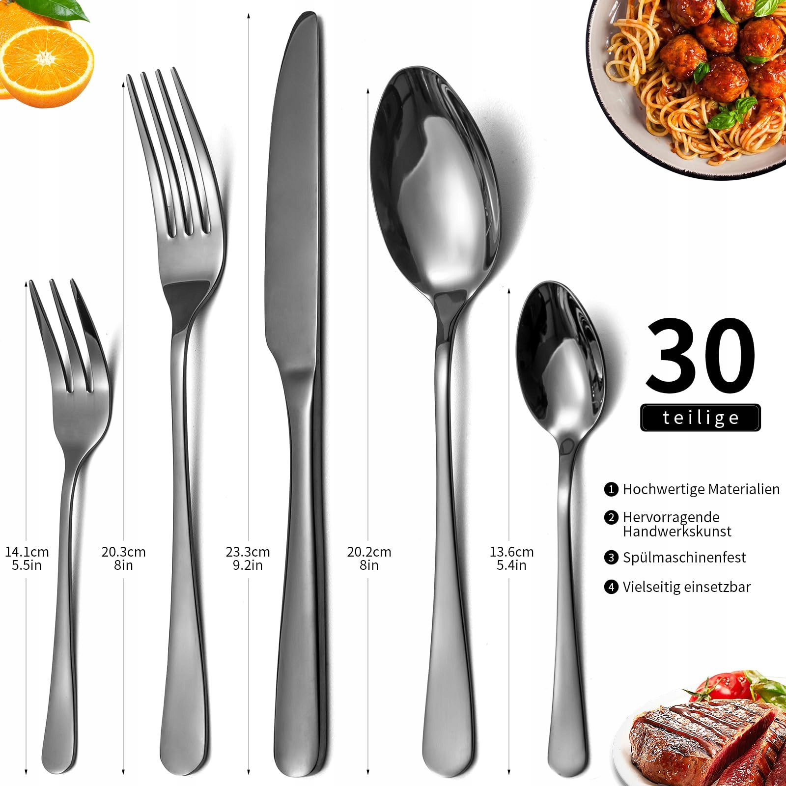 LAZAHOME Zestaw Sztućców, Polerowany Stal Nierdzewna 30-częściowy Zestaw Sztućców dla 6 Osób, Zestaw Sztućców z Nożem, Widelcem, Łyżką dla Rodziny/Imprezy/Hotelu/Restuacji, Czarny Sztućce Stołowe, Nadające się do Zmywarki