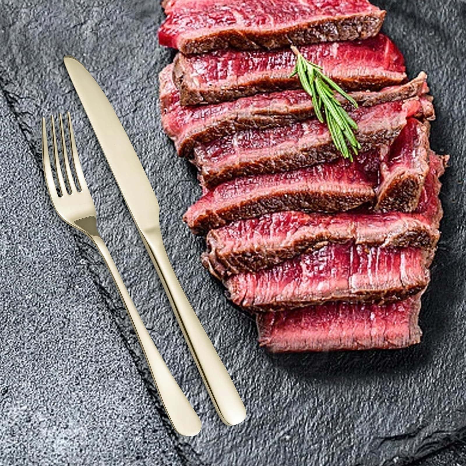 【Wytrzymały materiał】Nasz zestaw sztućców wykonany jest z wysokiej jakości, bezpiecznej dla żywności stali nierdzewnej, która jest bardzo trwała, odporna na korozję i rdzę oraz nie wydziela pozostałości ani zapachów jak inne materiały. Jednocześnie nasze zestawy sztućców są solidne i trwałe, aby zapewnić, że nie tylko nie łatwo się wyginają, ale także służą przez długi czas.
