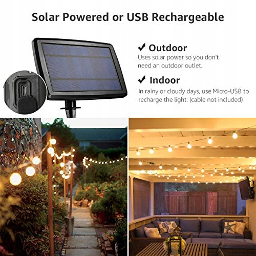 LE Solarne Lampki Łańcuchowe Żarówki Zewnętrzne, 7,62M 25 LED G40 Oświetlenie Zewnętrzne, Ładowane przez USB, 4 Tryby Łańcucha Świetlnego do Ogrodu, Wesela, Balkonu, Domu, Dekoracji Świątecznej, Ciepła Biel