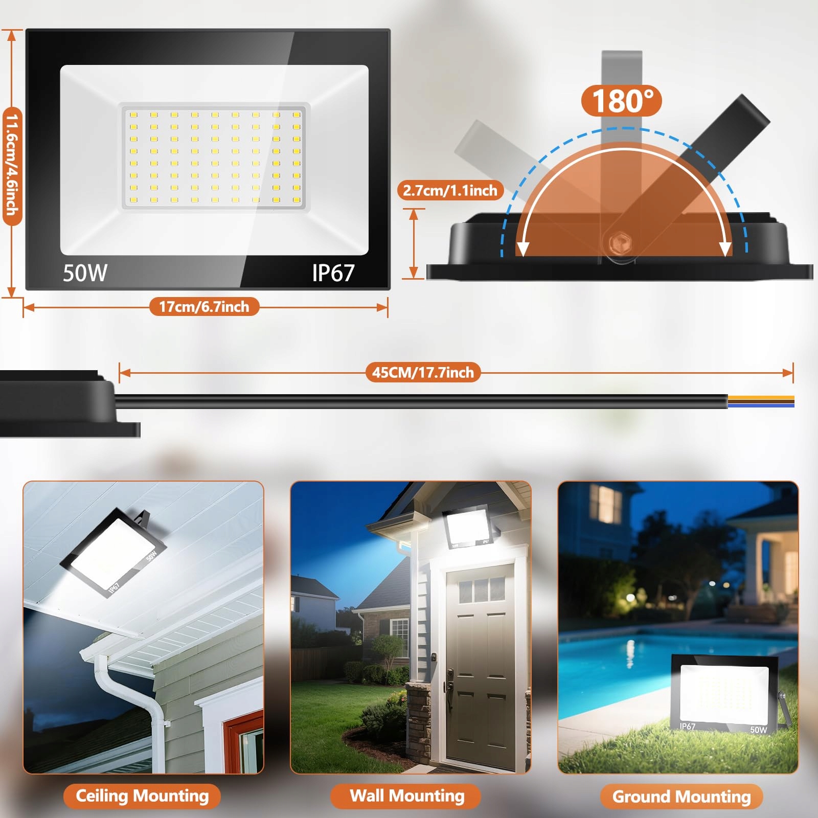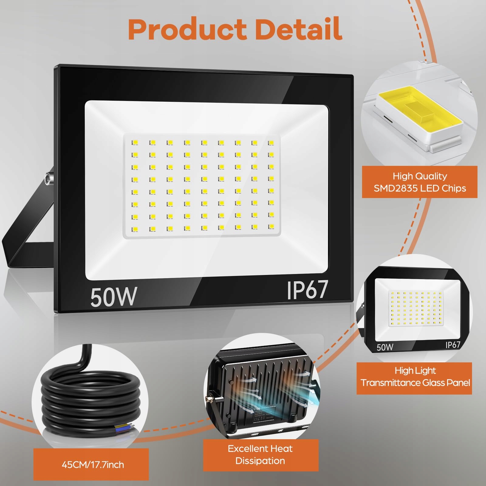 【Super jasny i oszczędność energii】Wyposażony w 72 wysokiej jakości chipy LED SMD2835, reflektor LED jest jaśniejszy niż każdy inny stary reflektor LED. Reflektor LED może generować do 5000lm wysokiej jasności, jest jaśniejszy i oszczędza ponad 85% energii w porównaniu do tradycyjnych halogenowych lamp zewnętrznych, zużywa znacznie mniej, bez obaw o wysokie rachunki za prąd.