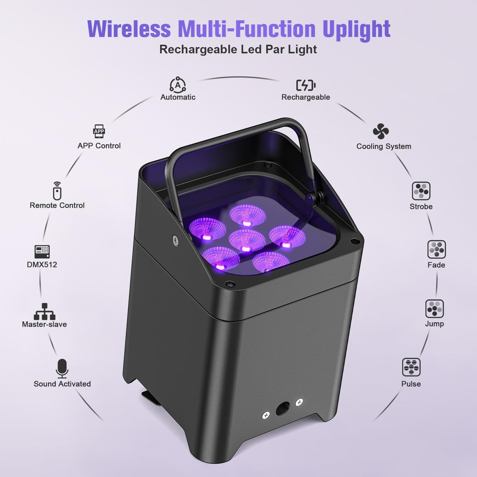 Zintegrowany akumulator - reflektor PAR z akumulatorem 9600 mAh do bezprzewodowego oświetlenia. 100 % prawdziwie bezprzewodowy! Wbudowany odbiornik bezprzewodowy DMX512 2,4 GHz umożliwia synchronizację wielu świateł bez kabli. Dzięki akumulatorowi gotowy do pracy bez podłączenia do prądu – idealny na mobilne wydarzenia.