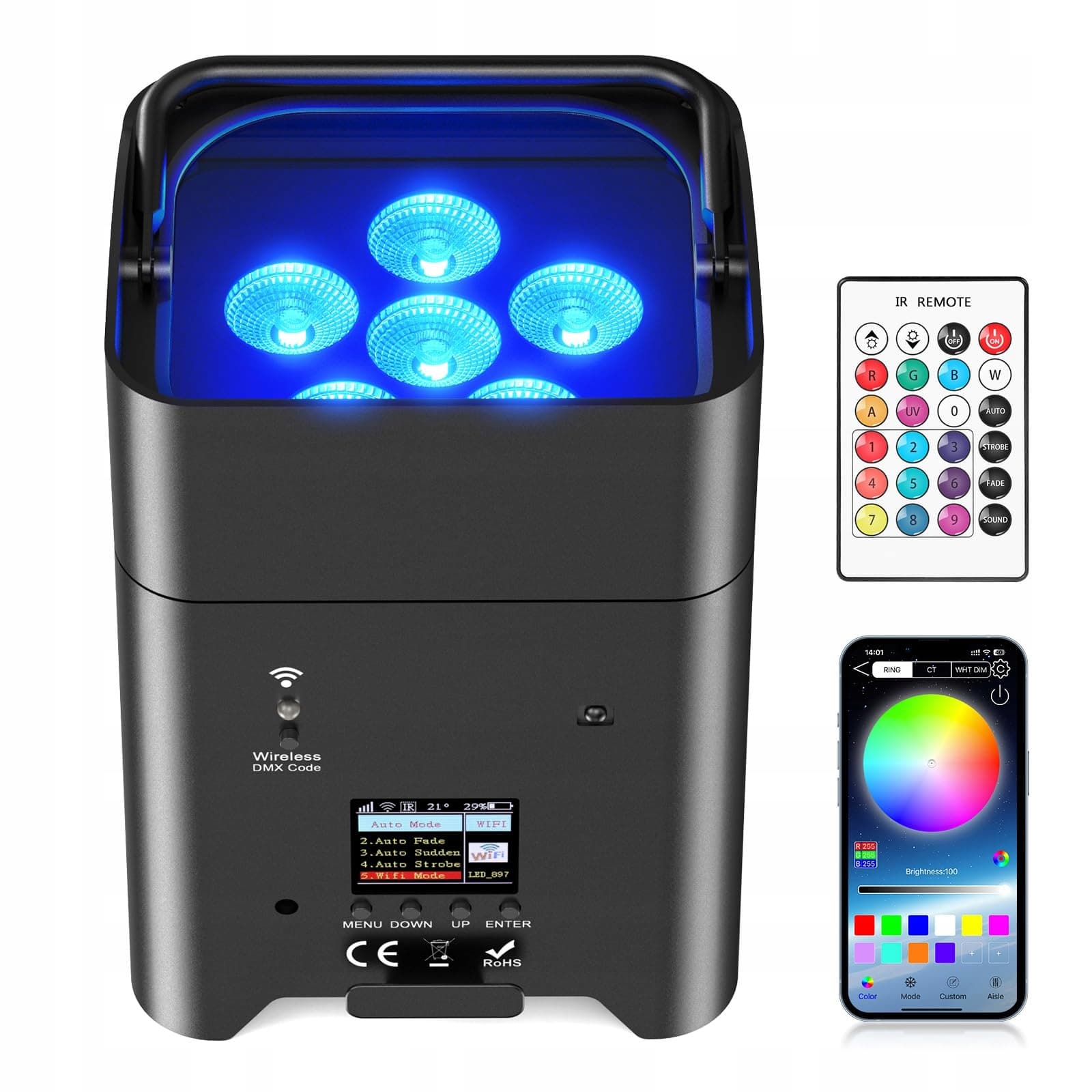 Różnorodne opcje sterowania - 6 trybów sterowania: bezprzewodowy DMX512 2,4 GHz, tryb master/slave, programy automatyczne, sterowanie dźwiękiem, pilot, kontrola Wi-Fi i aplikacja (iOS/Android). Idealne do profesjonalnych pokazów świetlnych lub użytku domowego.