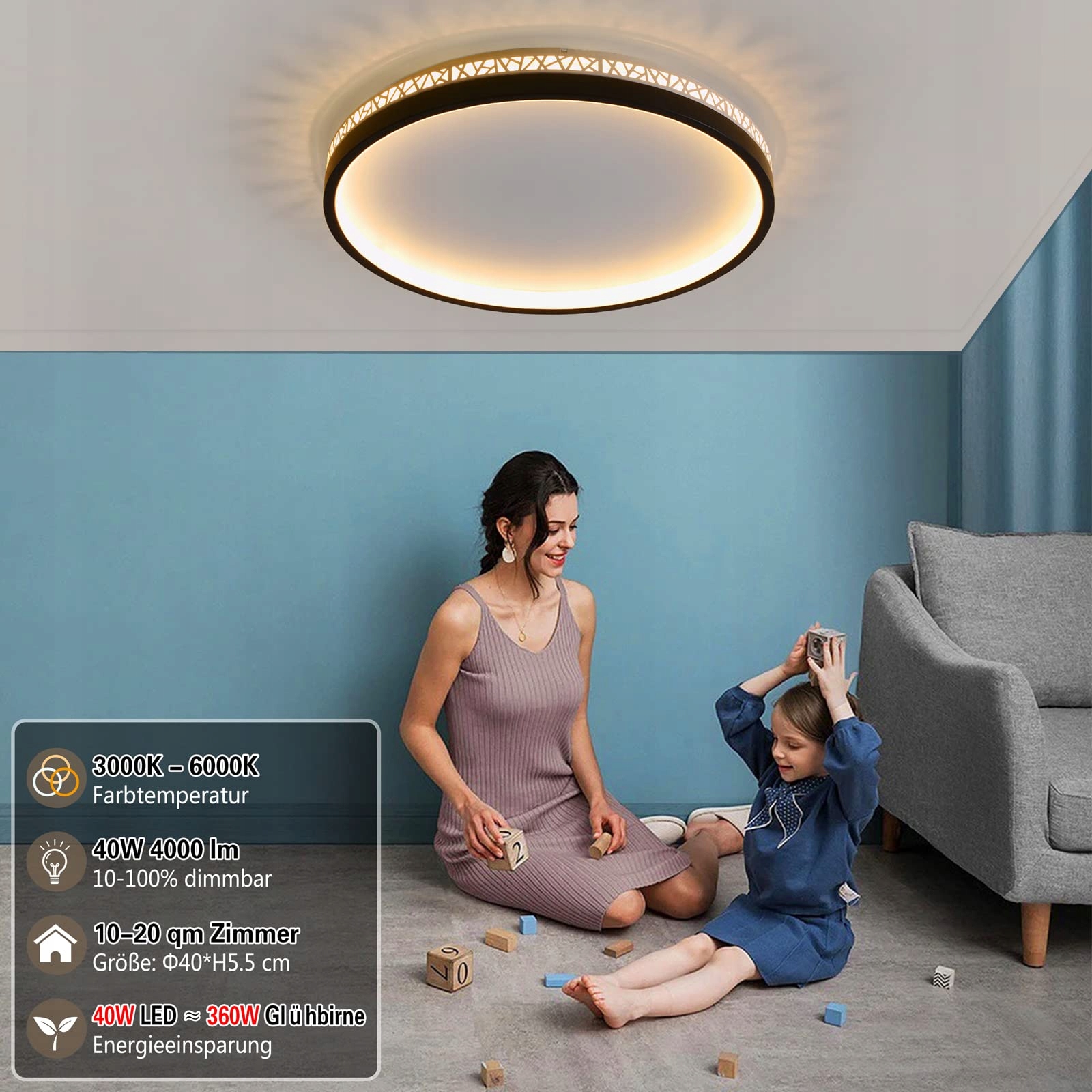 【Parametry lampy sufitowej】Rozmiar Φ40*H5.5 cm; z pilotem zdalnego sterowania zakres ściemniania 3000-6000 K; Napięcie AC220-240 V; Moc świetlna 40 W 4000 lm; Z funkcją pamięci, 4 W funkcja światła nocnego; Odpowiednia do pomieszczeń o powierzchni 10-20 m²