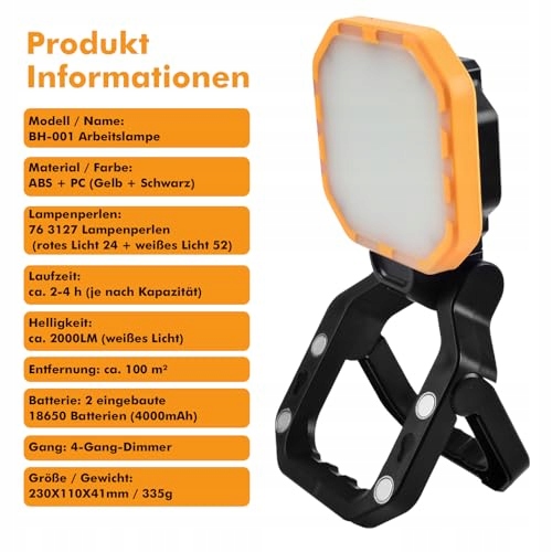 Wszechstronne oświetlenie – Reflektor LED z akumulatorem oferuje cztery różne tryby światła (słabe białe światło, mocne białe światło, czerwone światło, migające czerwone światło), co pozwala elastycznie dostosować lampę do swoich potrzeb. Ta wszechstronność czyni ją idealną do różnorodnych zastosowań takich jak kemping, awarie prądu czy plac budowy. Dzięki praktycznej funkcji zawsze możesz ustawić idealną jasność.