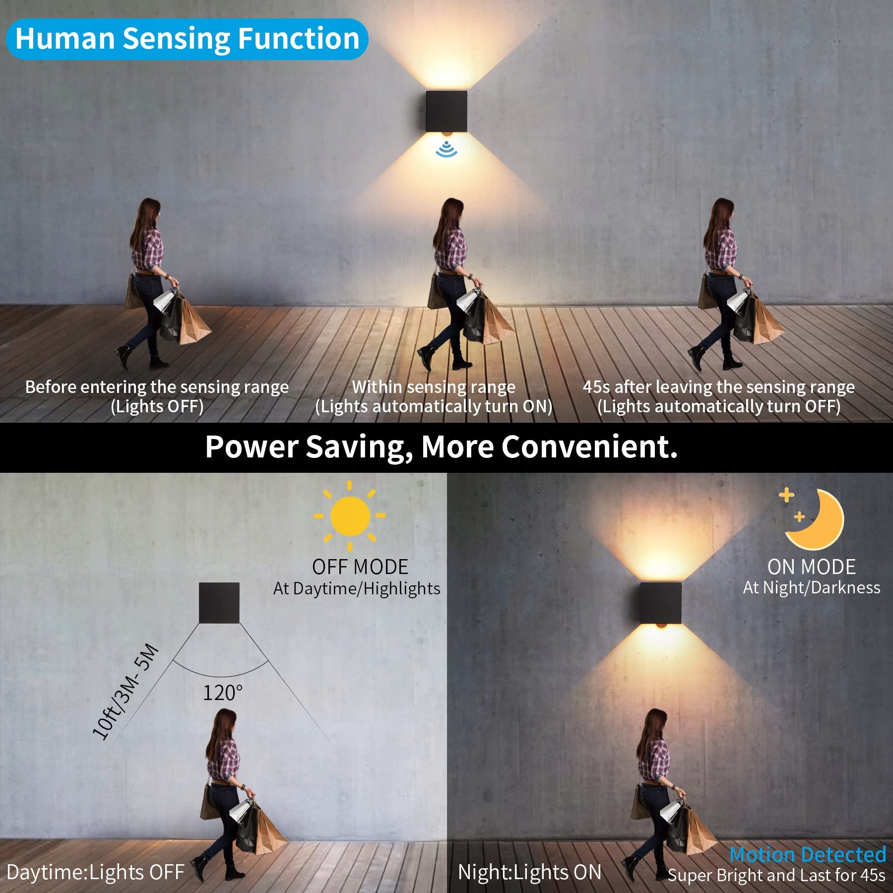 【Czujnik ruchu】 LED kinkiet wewnętrzny i zewnętrzny wyposażony jest w czujnik ruchu oraz iteracyjne ulepszenia produktu. Wykrywa ruchy ludzkie i automatycznie włącza oraz wyłącza lampę ścienną. Automatyczne wyłączanie w ciągu dnia, automatyczne włączanie w warunkach słabego oświetlenia (noc) w zasięgu wykrywania 3-5 metrów, lampa ścienna z czujnikiem ruchu automatycznie wyłącza się po 1 minucie braku aktywności.
