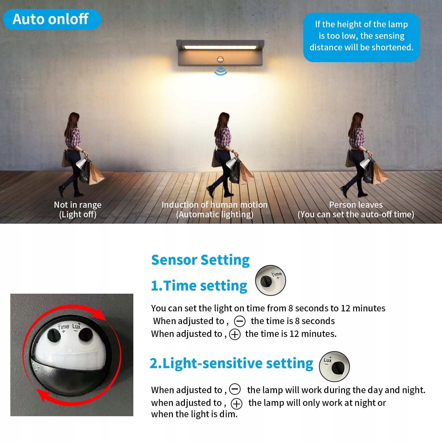 [Funkcja czujnika ruchu]1. Zewnętrzna lampa z czujnikiem ruchu włącza się automatycznie w promieniu od 3 do 10 metrów. 2. Możesz ustawić czujnik światła zewnętrznego, aby działał tylko w nocy lub zarówno w dzień, jak i w nocy. 3. Lampa ścienna włącza się automatycznie, gdy ktoś przechodzi obok. Jeśli nie ma ruchu, lampa ścienna wyłącza się automatycznie (czas wyłączenia lampy ściennej można ustawić od 10 sekund do 10 minut).