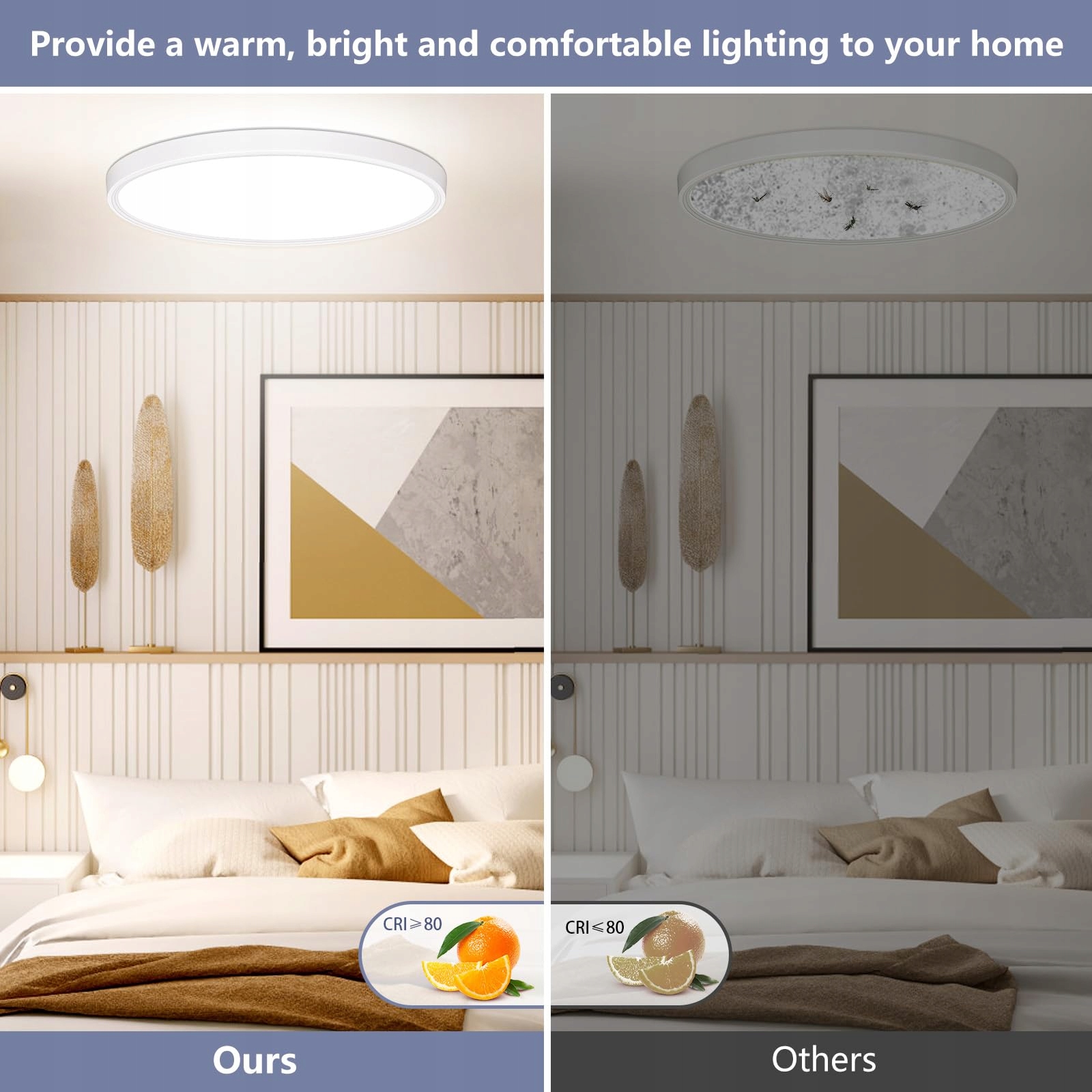 Ochrona oczu, wysoki wskaźnik oddawania barw: 18W 1600LM biała lampa sufitowa LED do korytarza ma wysoki wskaźnik oddawania barw (CRI>80). Bardziej realistyczne kolory są przyjemniejsze dla ludzkiego oka. Klosz lampy ma wysoką przepuszczalność światła, a światło jest równomierne i miękkie, bez olśnienia czy migotania. Równomiernie rozproszone światło w każdym kącie pomieszczenia. Doświadczenie wizualne jest bardziej komfortowe, lepiej chroni Twoje oczy.