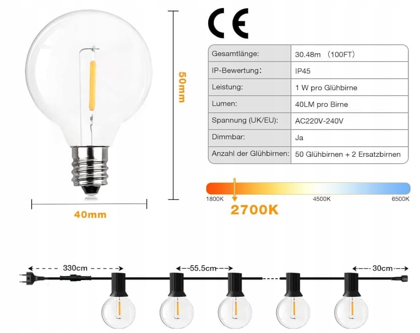53 x wysokiej jakości lampy LED G40: Wyposażona w 50 lamp LED G40 (zawieszonych na głównym przewodzie) i 3 zapasowe lampy, te lampy są wykonane z wysokiej jakości plastiku, luksusowe, o wysokiej przepuszczalności światła i odporne na stłuczenia, bezpieczniejsze i trwalsze niż tradycyjne lampy szklane. Każda żarówka działa niezależnie i ma standardowy typ, dzięki czemu można ją łatwo wymienić.