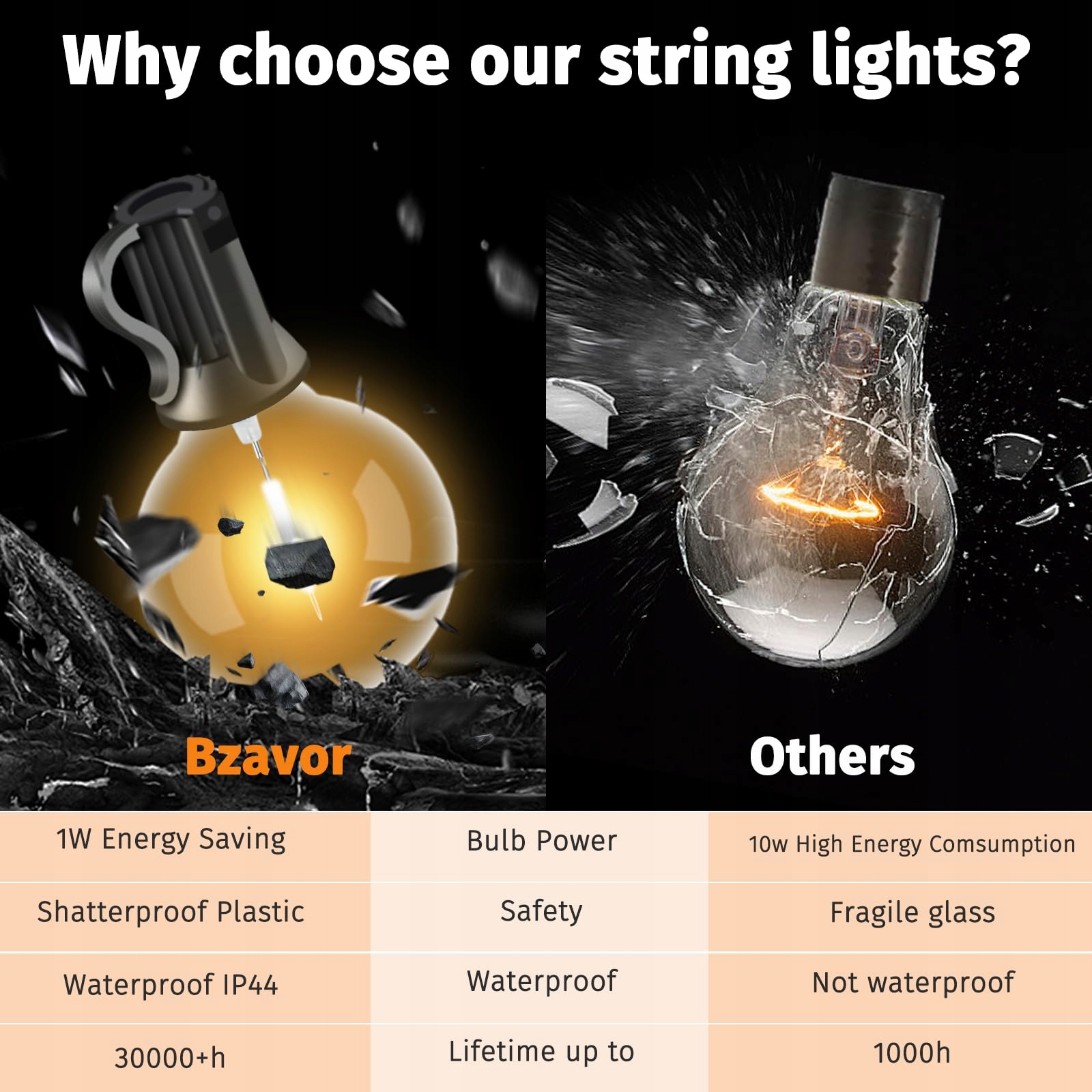 💡 [Efektywność energetyczna i bezpieczeństwo]: Bzavor Lichterkette Na Zewnątrz są wyposażone w nietłukące się żarówki LED-G40, które generują mniej ciepła. Każda żarówka ma 1W, w porównaniu do tradycyjnych żarówek oszczędzają ponad 90% energii i mają żywotność ponad 30 000 godzin. Plastikowy klosz jest solidny i bezpieczny w użyciu.