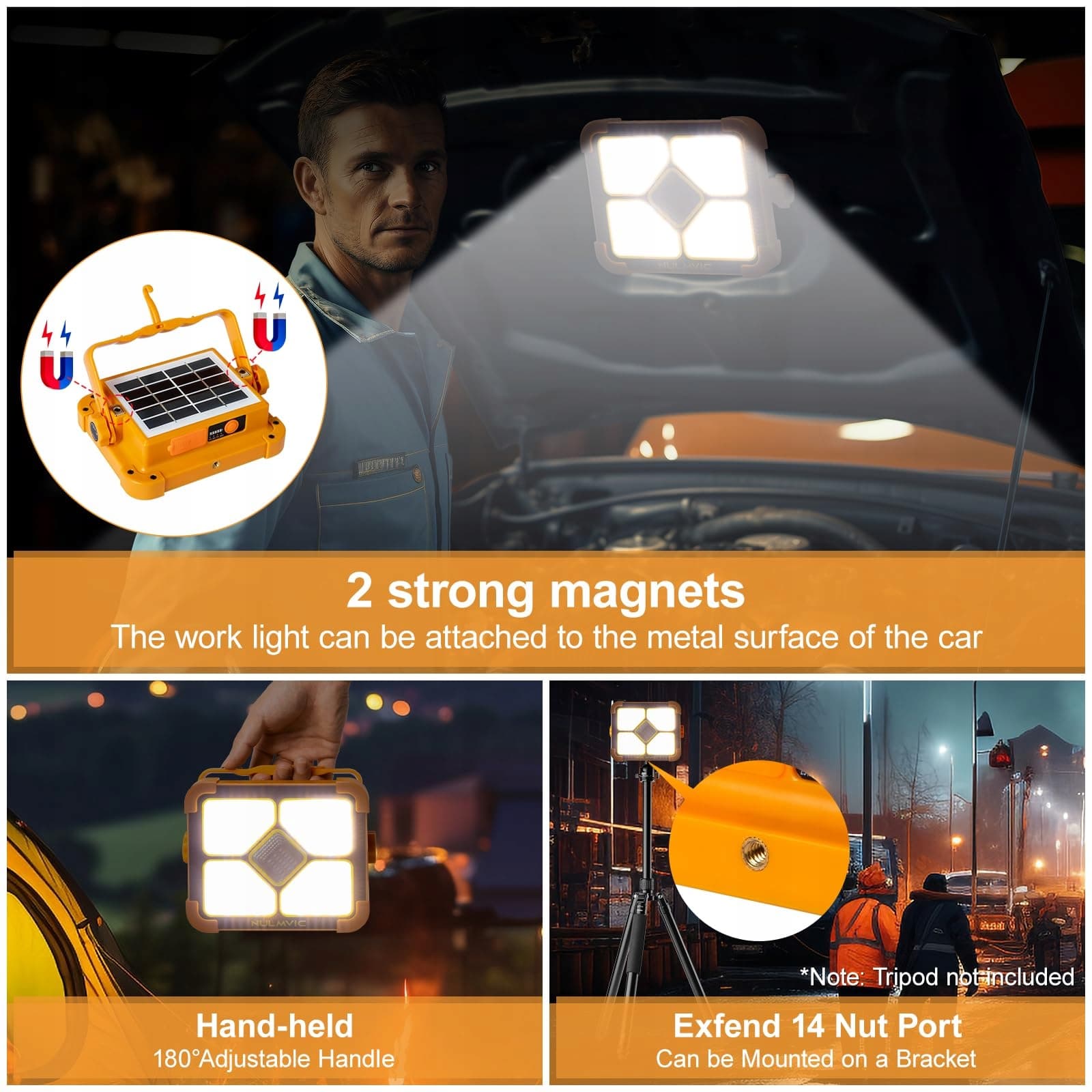 [MAGNETYCZNE BOKI I OBROTOWY UCHWYT 180°]Dzięki wbudowanym silnym magnesom po obu stronach, reflektor LED akumulatorowy można bezpiecznie przymocować do metalowych powierzchni, takich jak karoseria samochodu. Posiada również uchwyt obrotowy o 180°, dzięki czemu można go zawiesić lub postawić na ziemi, co czyni go niezwykle funkcjonalną lampą.