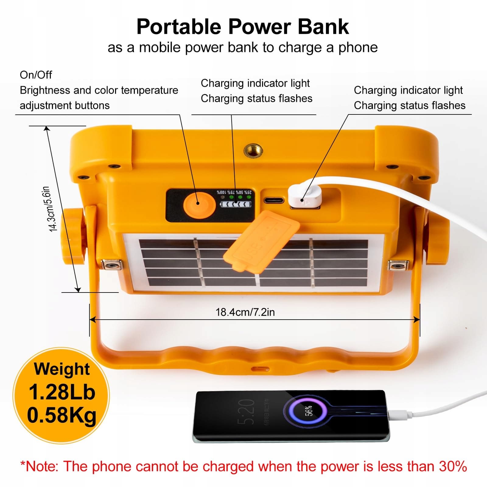 [2 metody ładowania i powerbank]Akumulatorowy reflektor LED może korzystać z dołączonego kabla USB-C 5V/1A, aby naładować lampę roboczą lub wykorzystać energię słoneczną. Jest bardzo energooszczędny i przyjazny dla środowiska. Może również działać jako powerbank o pojemności 6000 mAh, aby zasilać urządzenia elektroniczne, takie jak telefony komórkowe.