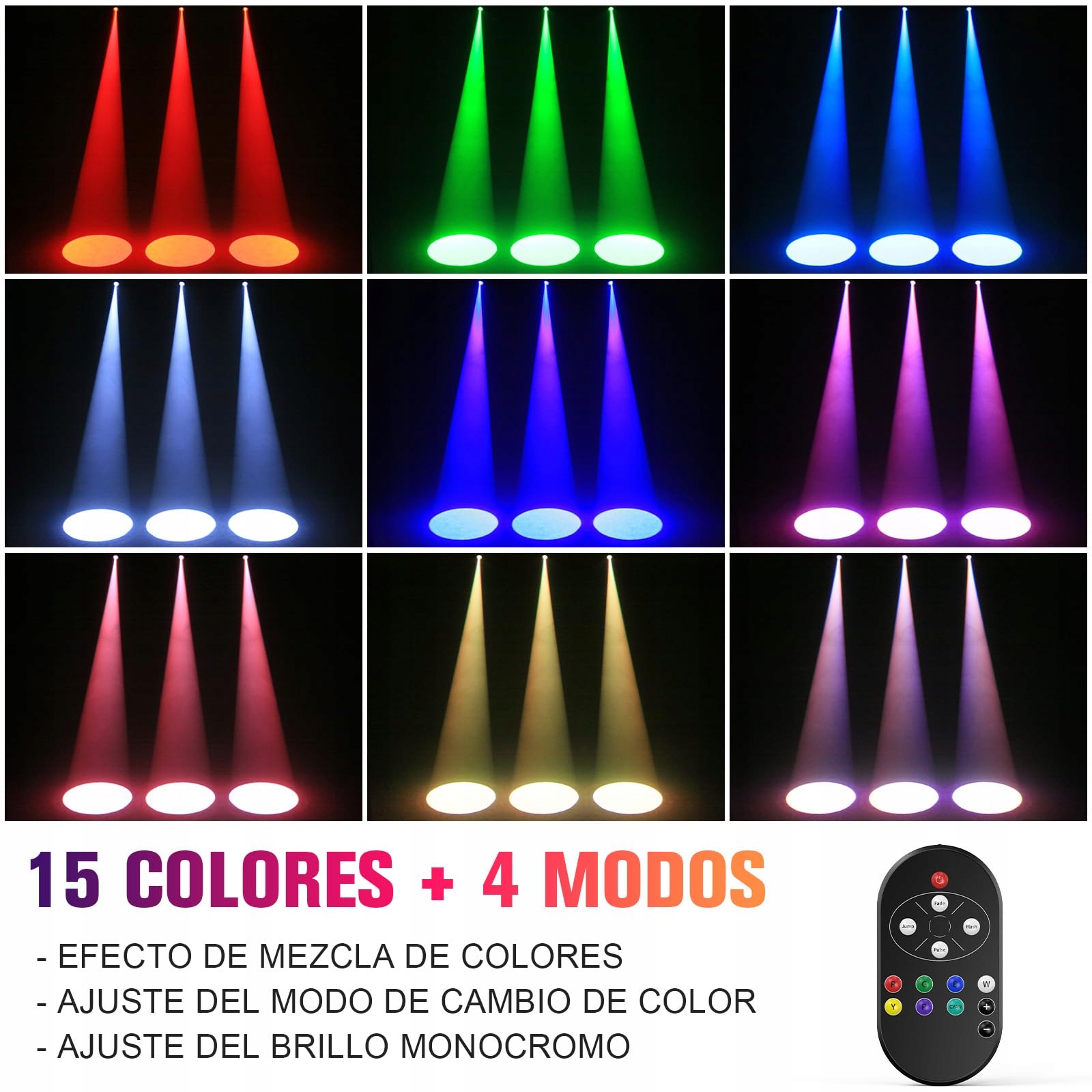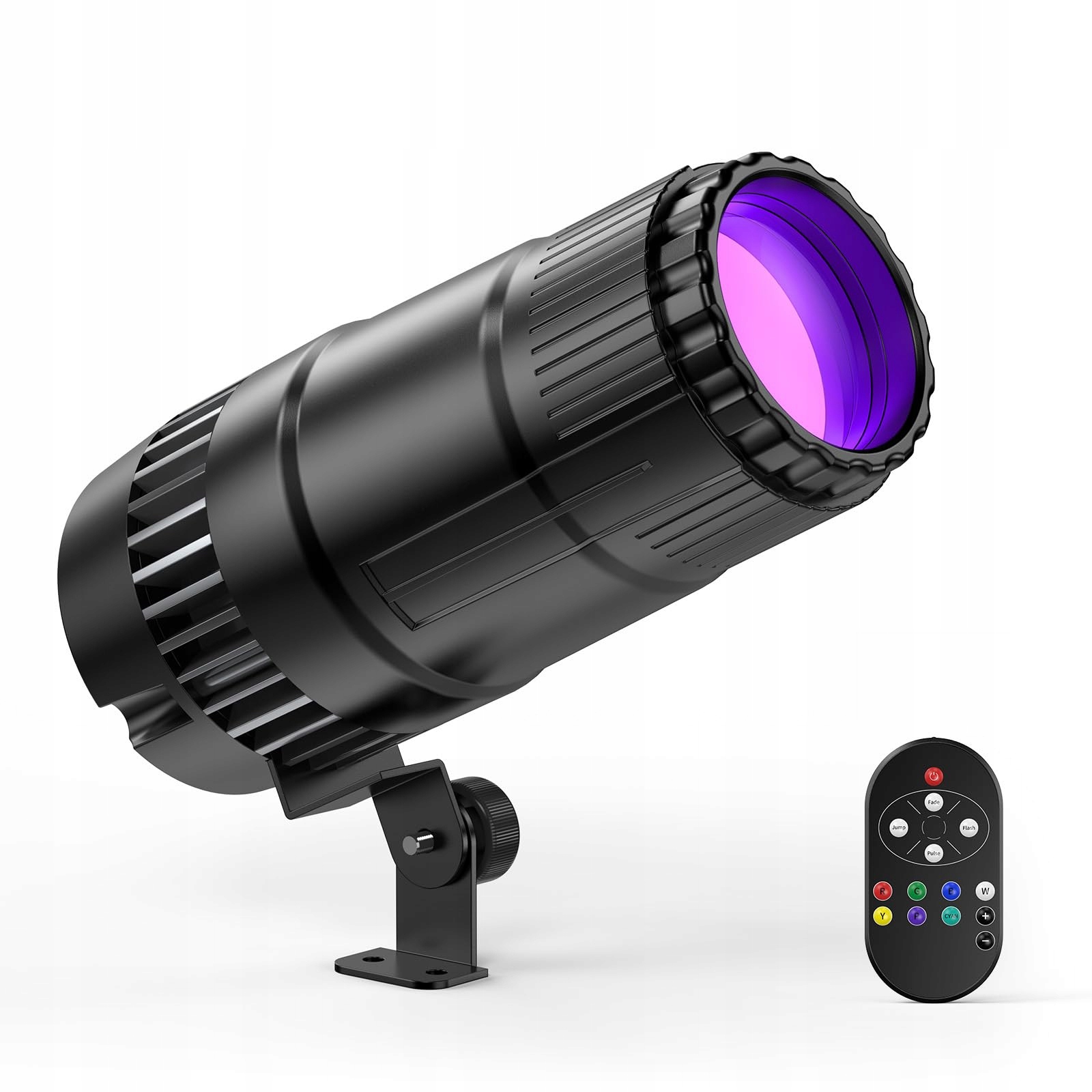 Wiele efektów: Reflektor obsługuje cztery tryby (skok/stroboskop/oddychanie/zanikanie). Za pomocą pilota 433 MHz RGBWYP+CYAN możesz dostosować kolor, tryb i prędkość, tworząc ulubione pokazy świetlne.