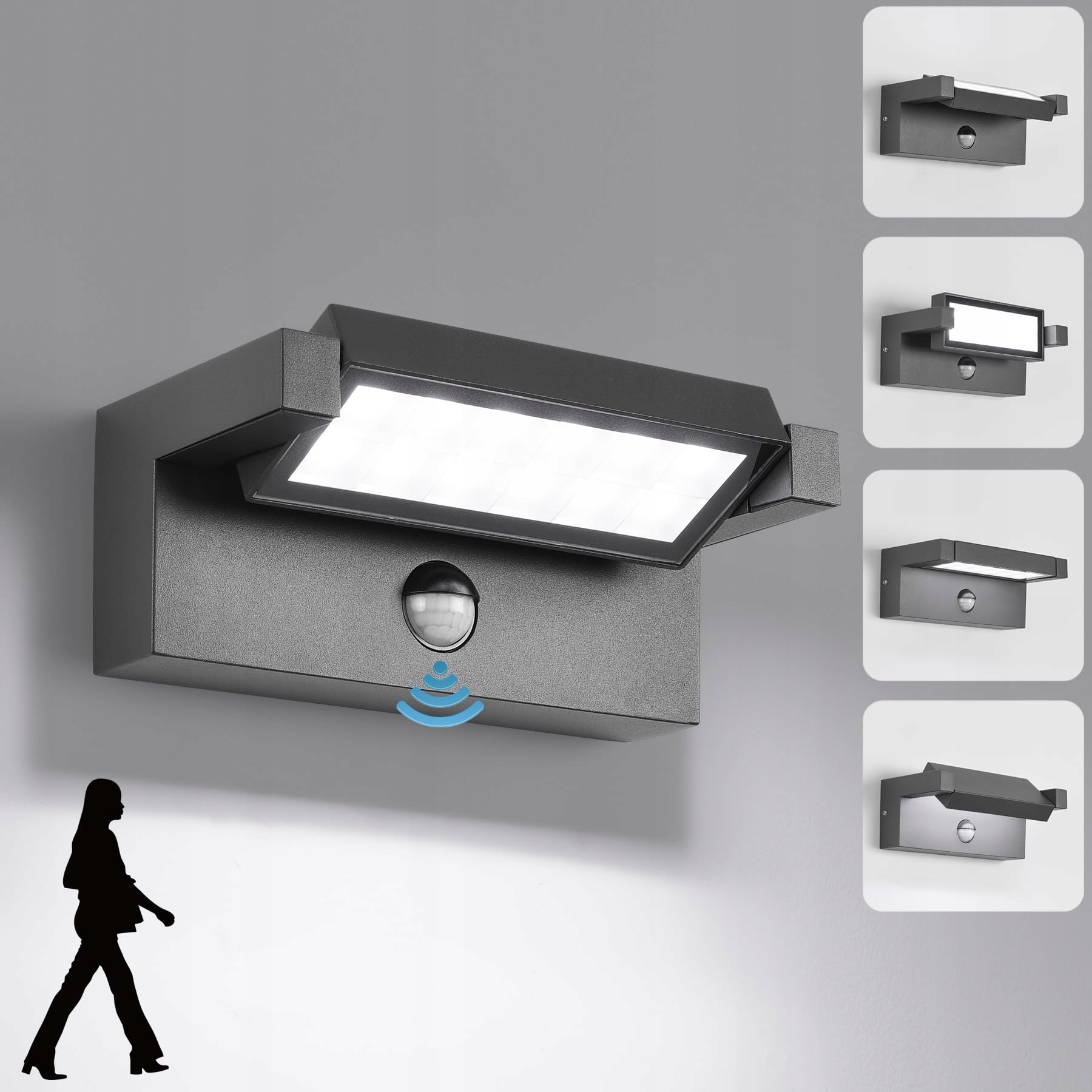 LED Lampa Ścienna Zewnętrzna Wewnętrzna z Czujnikiem Ruchu, 22W Lampa Zewnętrzna na Ścianę, IP65 Wodoodporna Lampa Ścienna Zewnętrzna 6500K Zimna Biała Lampa Ścienna, Lampa Zewnętrzna z Panelem Obrotowym 350° do Ogrodu Tarasu Ciemnoszara