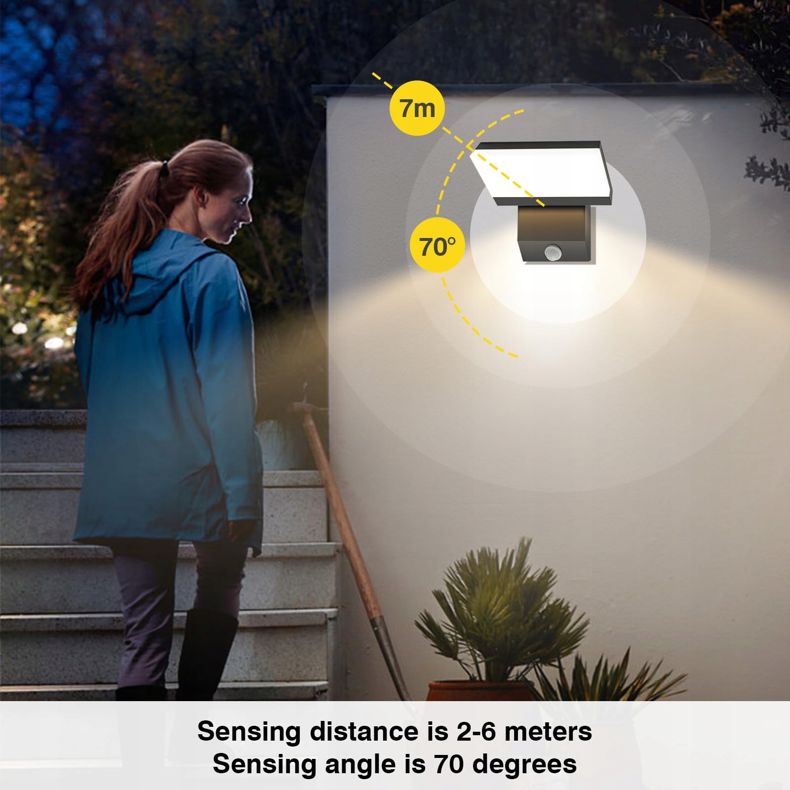 Lampa ścienna z czujnikiem ruchu: Ta lampa zewnętrzna z czujnikiem ruchu wykrywa ruch w promieniu 6 metrów i natychmiast włącza się po zmroku. Wyłącza się automatycznie 50–60 sekund po zakończeniu ruchu. Dla optymalnej pracy czujnika ruchu na zewnątrz zaleca się montaż na wysokości od 2,0 do 2,4 metra.