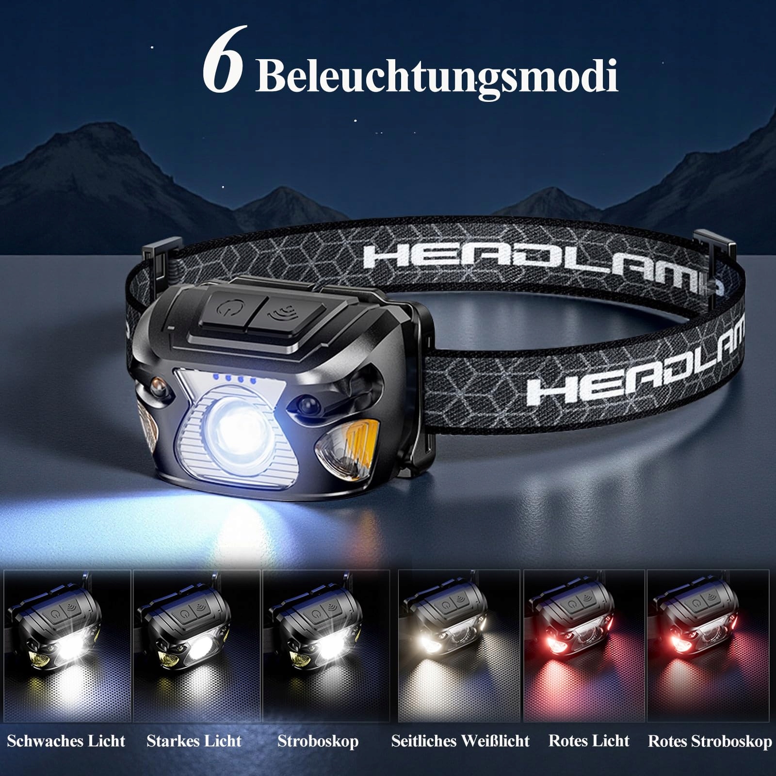 【6 trybów światła latarki czołowej LED】Latarki czołowe dla dorosłych oferują 6 trybów: jasne białe, przyciemnione białe, białe światło stroboskopowe, żółte światło boczne, czerwone światło boczne oraz czerwone światło stroboskopowe – idealne dla potrzeb czerwonego światła podczas biegania. Funkcja wykrywania fal pozwala na sterowanie bez użycia rąk, dzięki czemu ta wielokrotnie ładowana latarka czołowa jest dostosowana do każdej sytuacji.