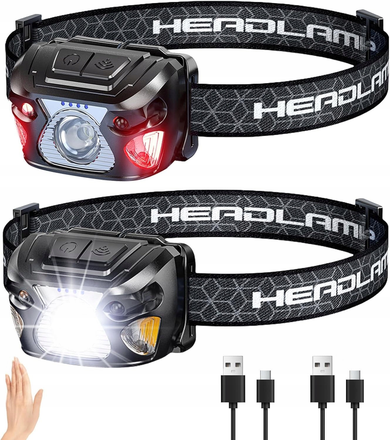 Latarka czołowa LED wielokrotnego ładowania, 2 sztuki superjasne 2000 lumenów latarka czołowa z 6 trybami, czerwone światło i czujnik, wodoodporna IPX5 latarka czołowa LED do campingu, wędkowania, biegania, wędrówek