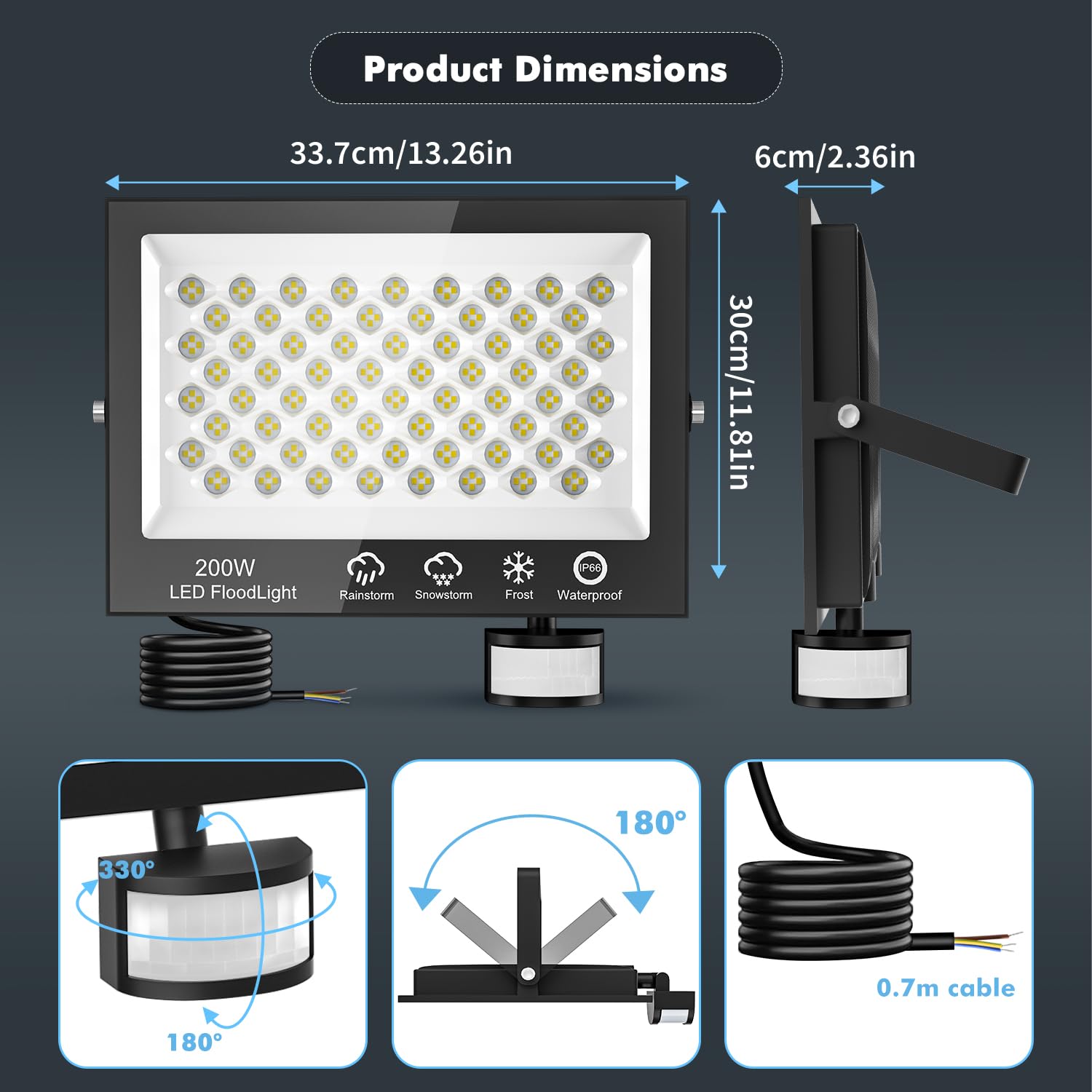 200W LED reflektor z czujnikiem ruchu na zewnątrz, super jasny 20000LM reflektor zewnętrzny, wodoodporny IP66 LED lampa zewnętrzna z pilotem, 6500K zimna biel reflektor zewnętrzny do ogrodu, garażu, podwórka