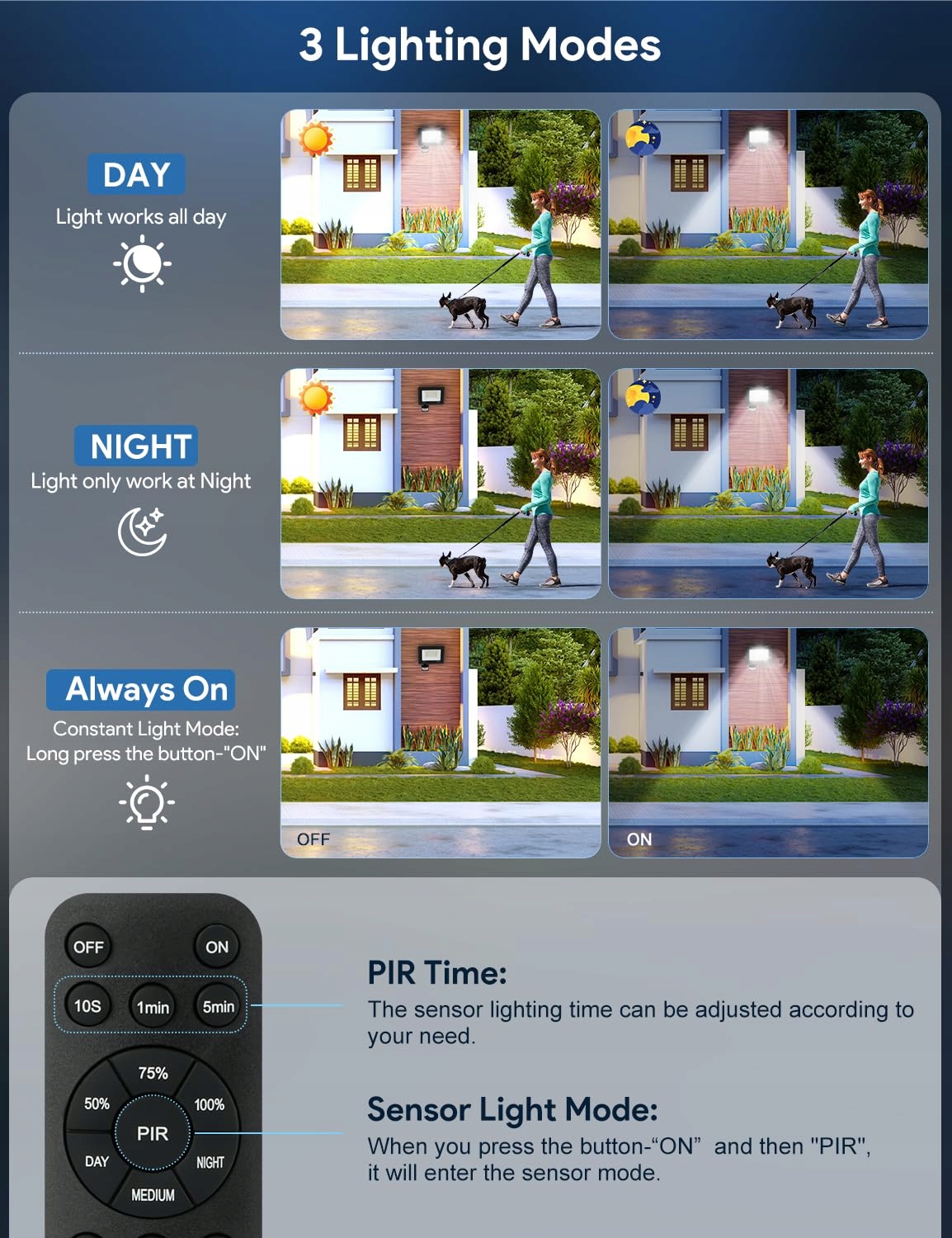 Reflektor LED na zewnątrz z 3 trybami pracy -- Reflektor LED ma 3 tryby pracy, z których możesz wybierać, tryb światła stałego - przytrzymaj przycisk WŁĄCZ przez długi czas; Dwa tryby indukcji PIR (muszą być aktywowane po naciśnięciu 'PIR'): 24-godzinny tryb czujnika i tylko nocny tryb czujnika ruchu PIR, funkcja timera (3H)