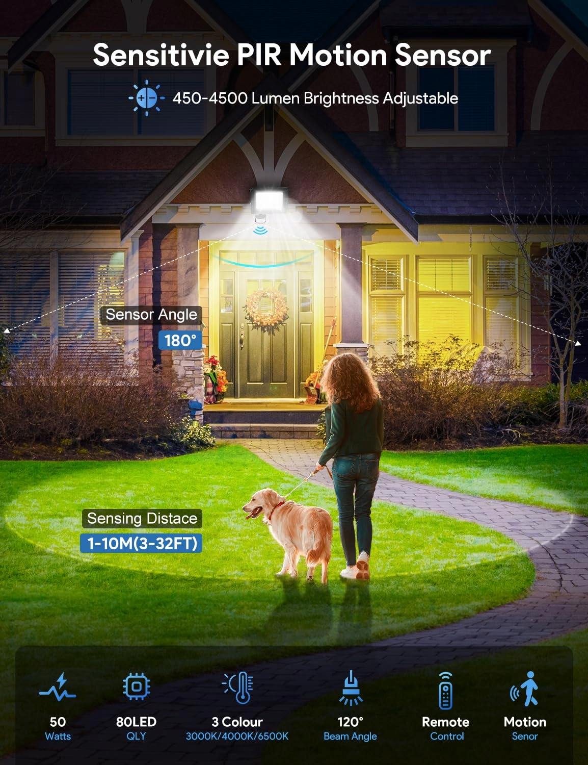 50W LED Reflektor z czujnikiem ruchu na zewnątrz, 450-4500LM Dimmowalny reflektor zdalnie sterowany, IP66 Wodoodporny reflektor ciepłobiały, neutralny i zimny biały LED do ogrodu, podwórka, garażu