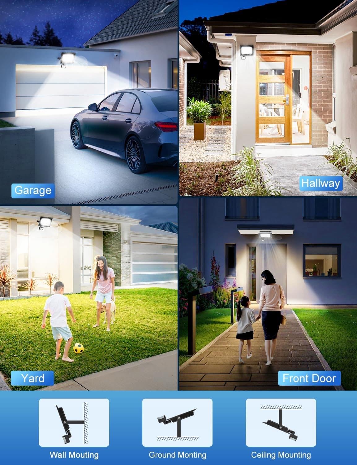 IP66 Wodoodporny i szerokie zastosowanie -- Lampa LED na zewnątrz z czujnikiem ruchu ma klasę ochrony IP66, obudowa reflektora LED jest solidna i odporna na warunki atmosferyczne, odporna na wysokie i niskie temperatury, nadaje się do użytku wewnętrznego i zewnętrznego. Szeroko stosowana przy drzwiach wejściowych, w ogrodzie, garażu, ogrodzeniach, na podwórku, w korytarzach, piwnicach itp.
