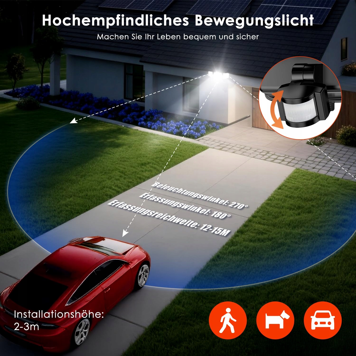 【Bardzo jasny reflektor z czujnikiem ruchu】Te bateriozasilane lampy zewnętrzne wyposażone są w 302 wysokiej jakości diody LED, jasność do 1500 lm, mogą skutecznie oświetlać zarówno obszary zewnętrzne, jak i wewnętrzne, tworząc jasny efekt świetlny.