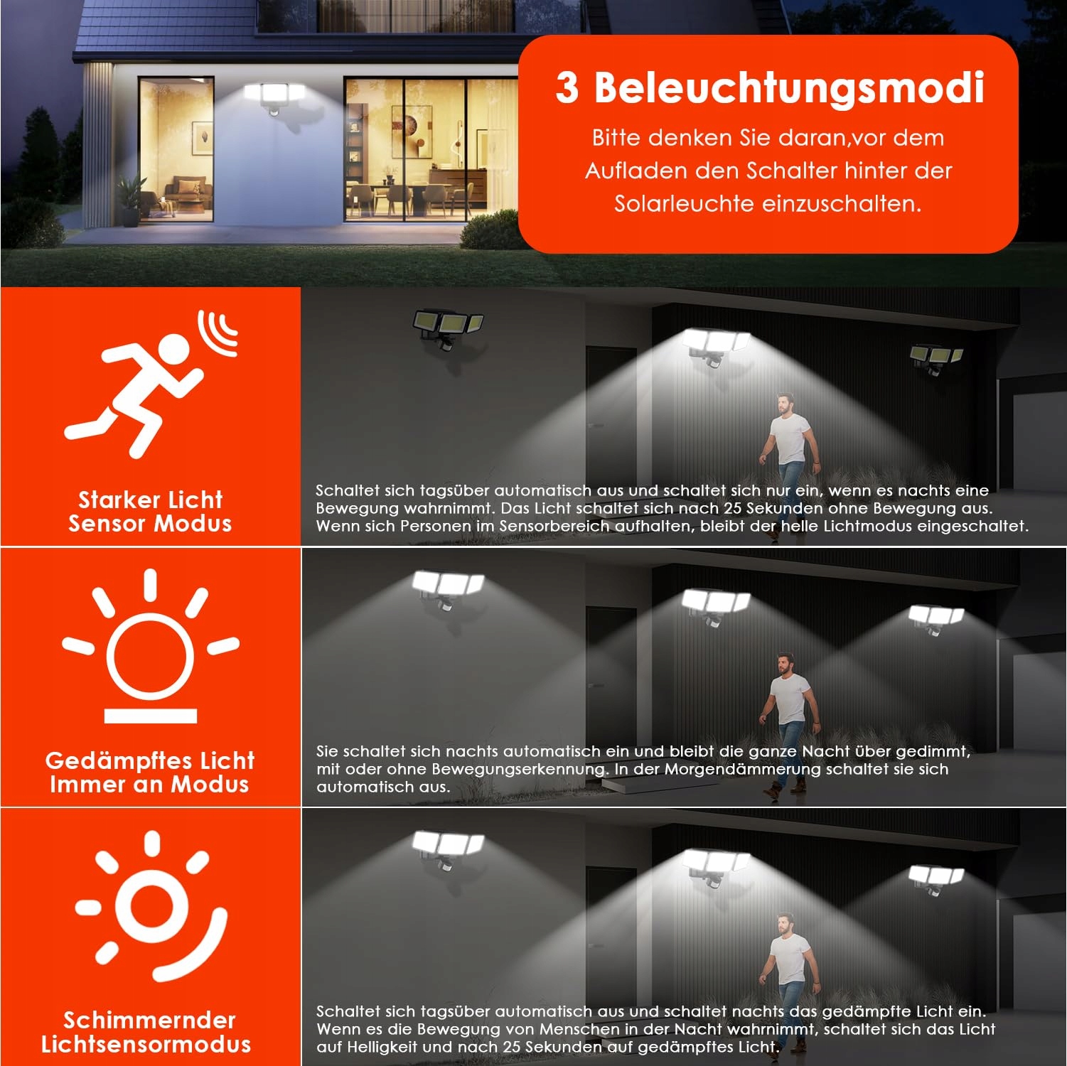 【Lampy bezpieczeństwa z 3 trybami oświetlenia】Lampy z czujnikiem ruchu mają 3 tryby oświetlenia. Lampę bezpieczeństwa można ustawić na tryb silnego czujnika światła, tryb długiego jasnego światła o niskiej jasności oraz tryb migotania z czujnikiem, aby spełnić codzienne potrzeby oświetleniowe. (Proszę pamiętać, aby włączyć przełącznik z tyłu lampy i przed użyciem przełączyć na wybrany tryb)