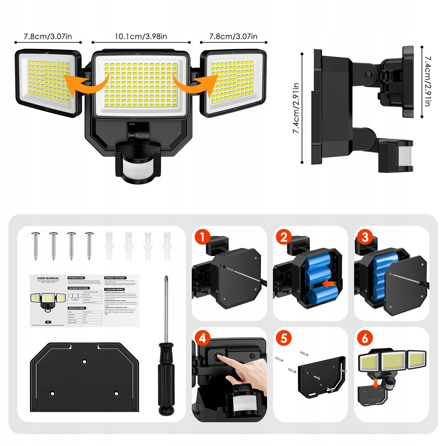 【Regulowana konstrukcja i łatwy montaż】Bateriozasilana lampa z trzema regulowanymi głowicami obrotowymi; dzięki temu można dostosować obszar oświetlenia według własnych potrzeb. Zasięg wykrywania do 15 m (49,2 stopy), kąt wykrywania 180°, kąt oświetlenia 270°, co zapewnia szersze pokrycie światłem, aby oświetlić każde miejsce, gdzie jest potrzebne światło.