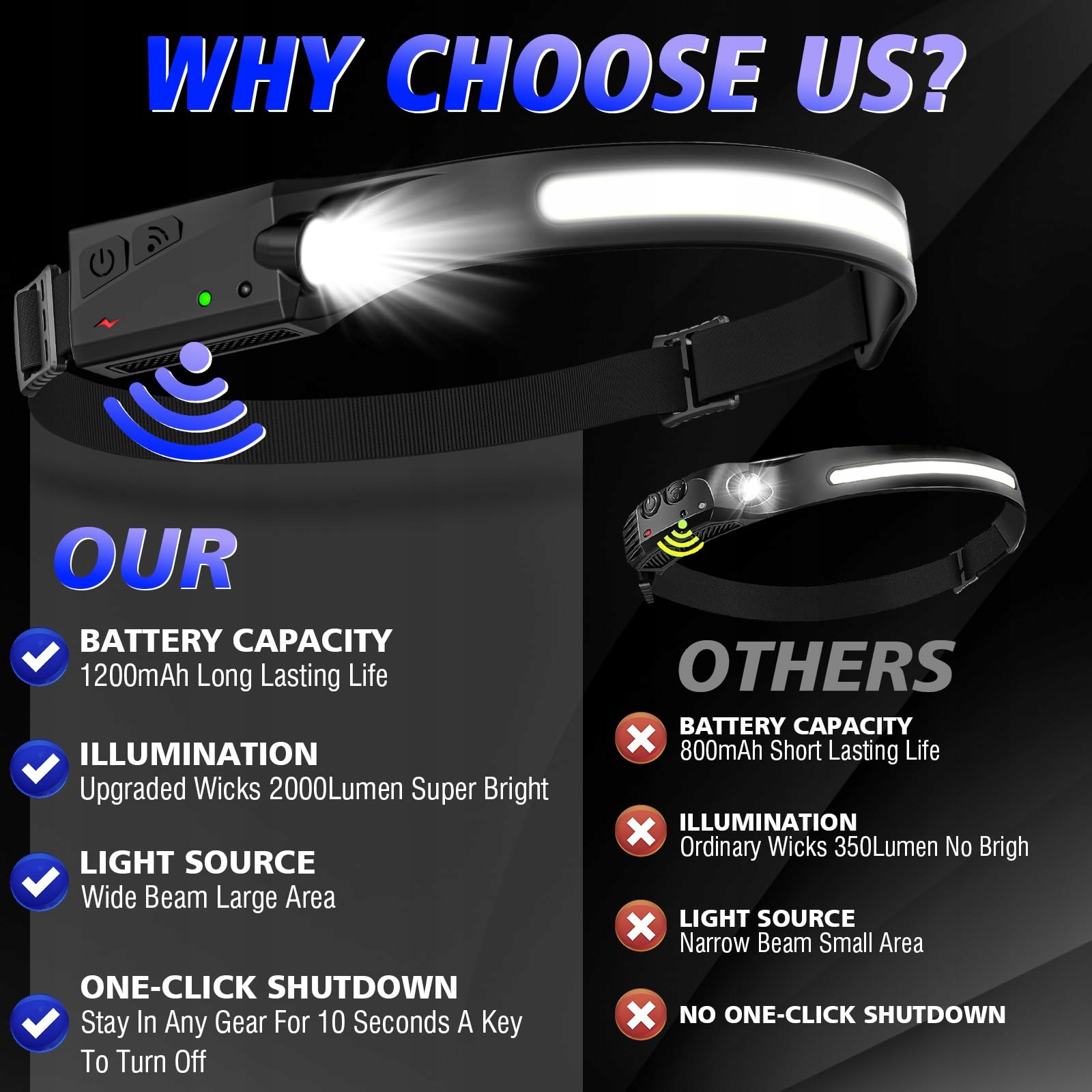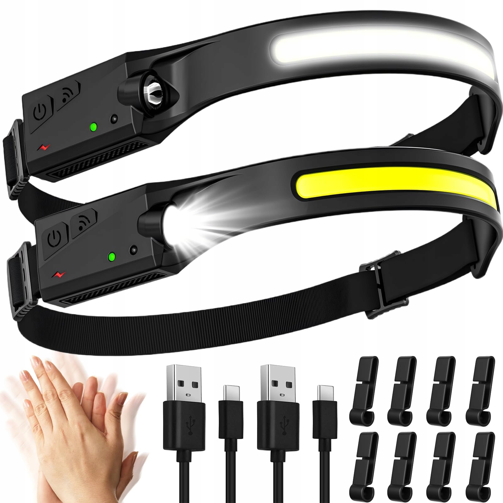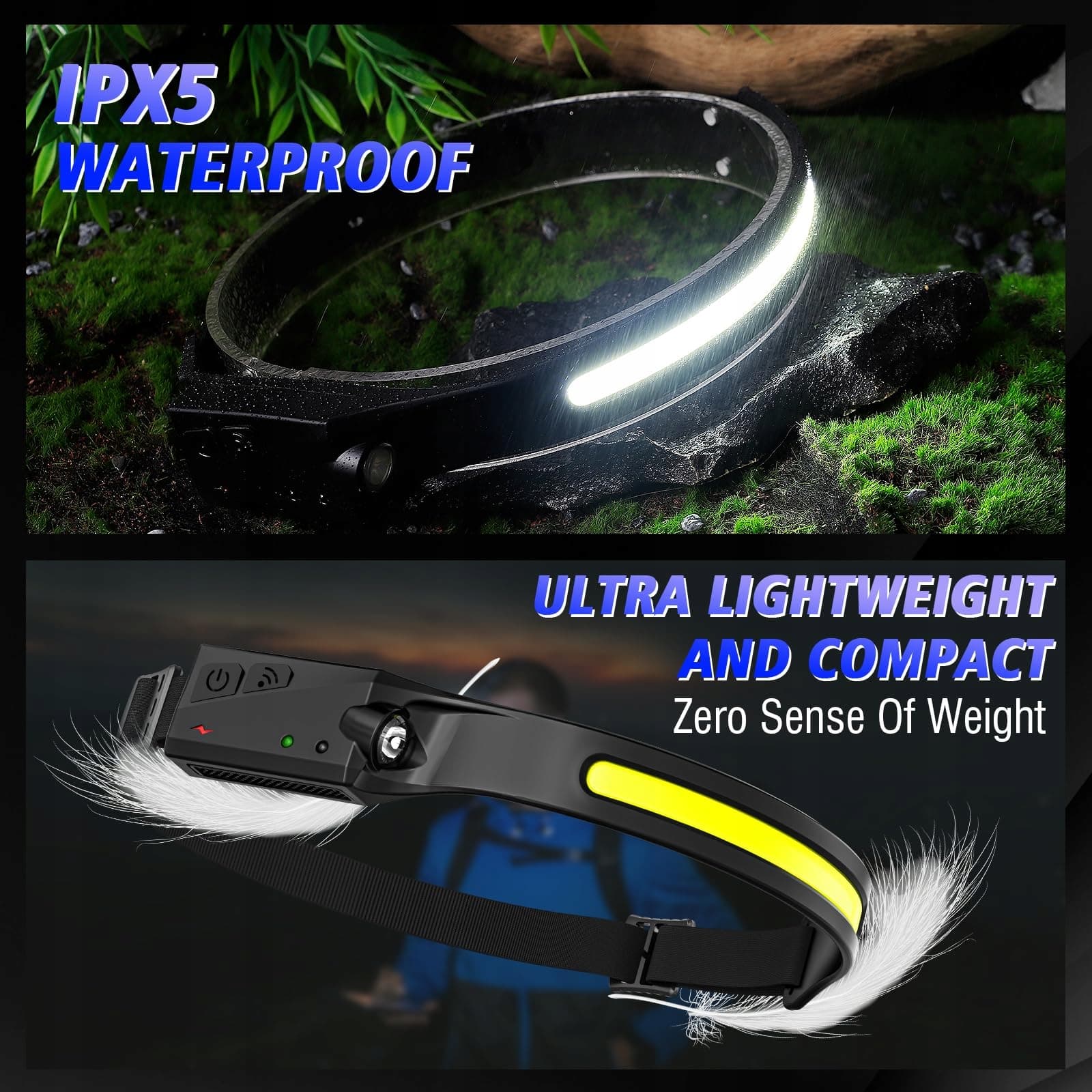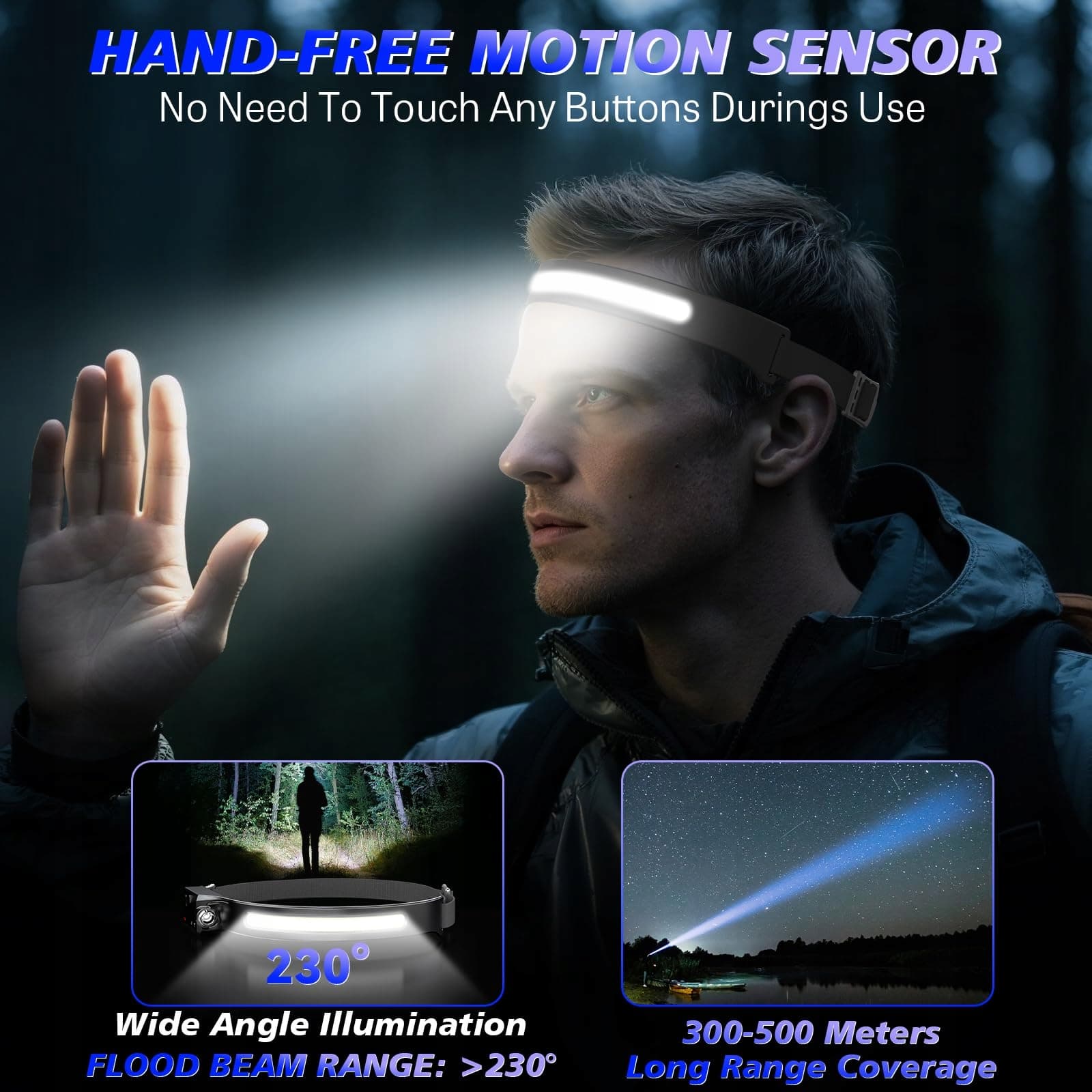 5 TRYBÓW ŚWIATŁA i CZUJNIK INDUKCYJNY: Czołówka COB i XPE LED posiada 5 trybów światła. W każdym innym trybie naciśnij i przytrzymaj przycisk włączania/wyłączania, aby włączyć tryb stroboskopowy. Czołówka wyposażona jest w wysokiej jakości czujnik ruchu. Gdy przełącznik funkcji czujnika jest włączony, możesz włączać i wyłączać światło, machając ręką w obszarze działania czujnika