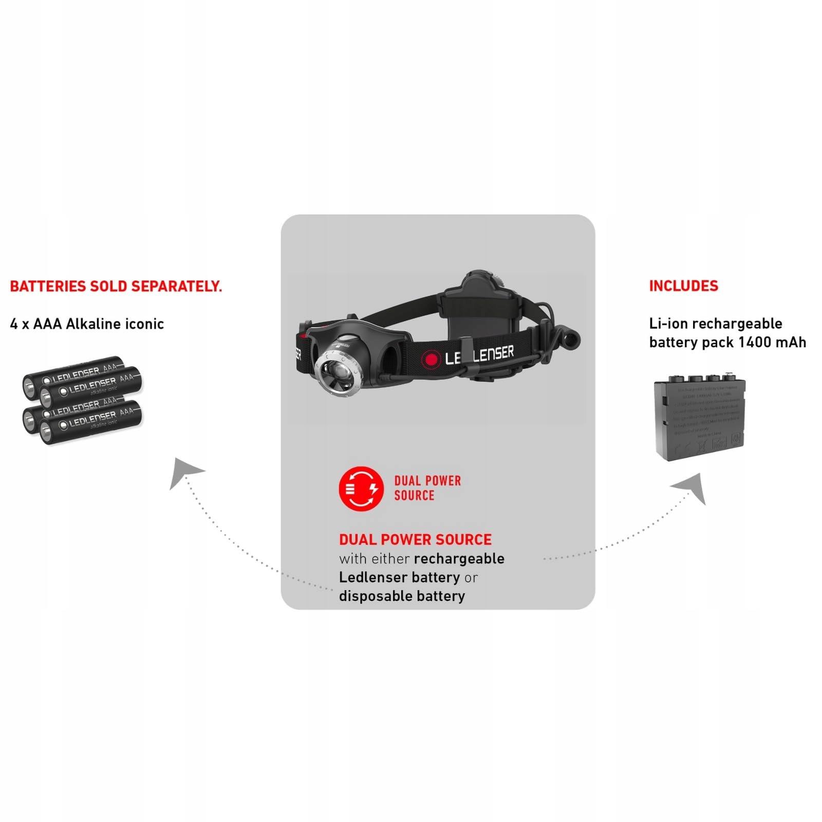 Latarka czołowa Ledlenser H7R.2 LED, ładowana akumulatorem litowym, również zasilana 4xAAA, z funkcją ogniskowania, 300 lumenów, płynnie ściemniana, zasięg świecenia 160m, czerwone światło tylne, kabel USB do ładowania, obrotowa