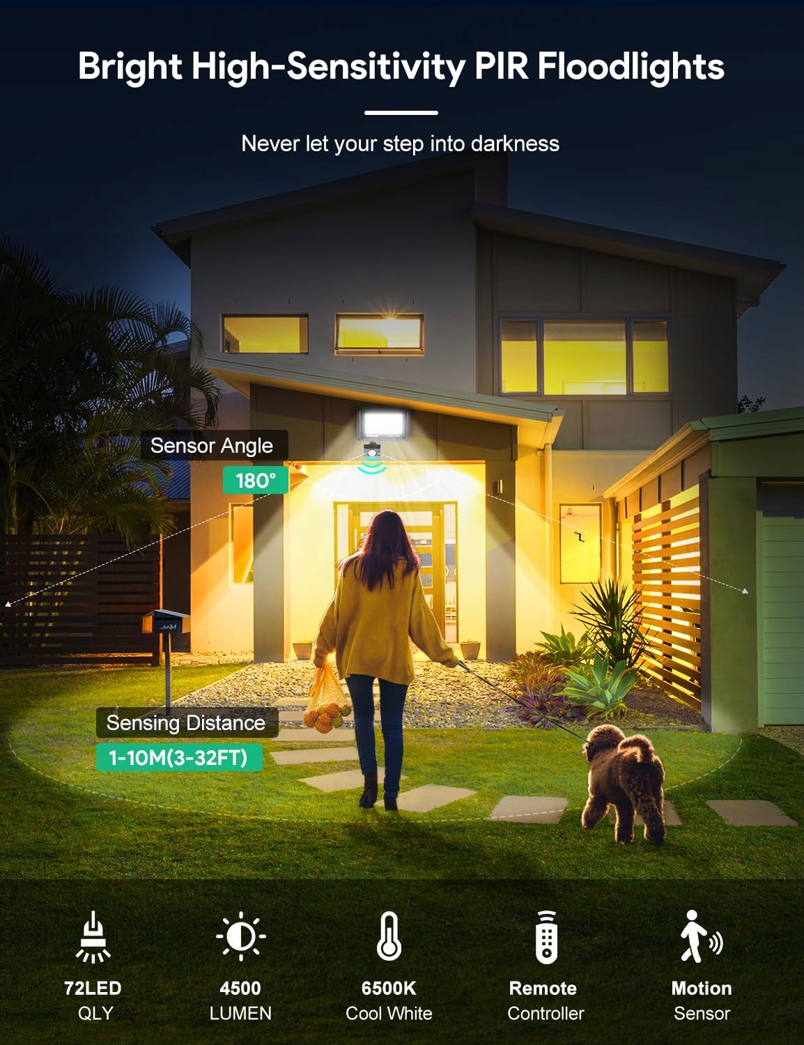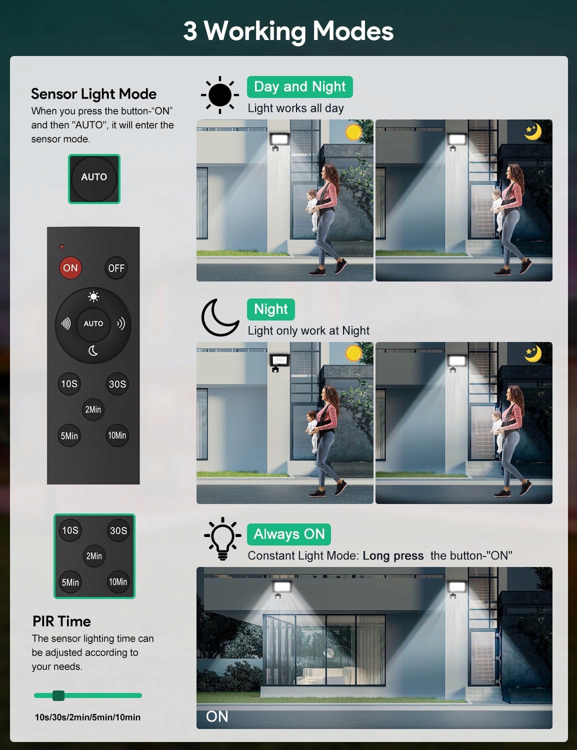 【Reflektor LED z pilotem】Zaktualizowane reflektory LED są dostarczane z pilotem, który umożliwia łatwe włączanie i wyłączanie światła, eliminując konieczność męczącego wspinania się po drabinie, aby dostosować czujnik. Prosta regulacja stałego światła, trybu czujnika ruchu PIR (dzień/noc), czułości (maksymalny zasięg wykrywania do 10 m). Można również ustawić czas świecenia po wykryciu ruchu (10s/30s/2min/5min/10min) w trybie czujnika.