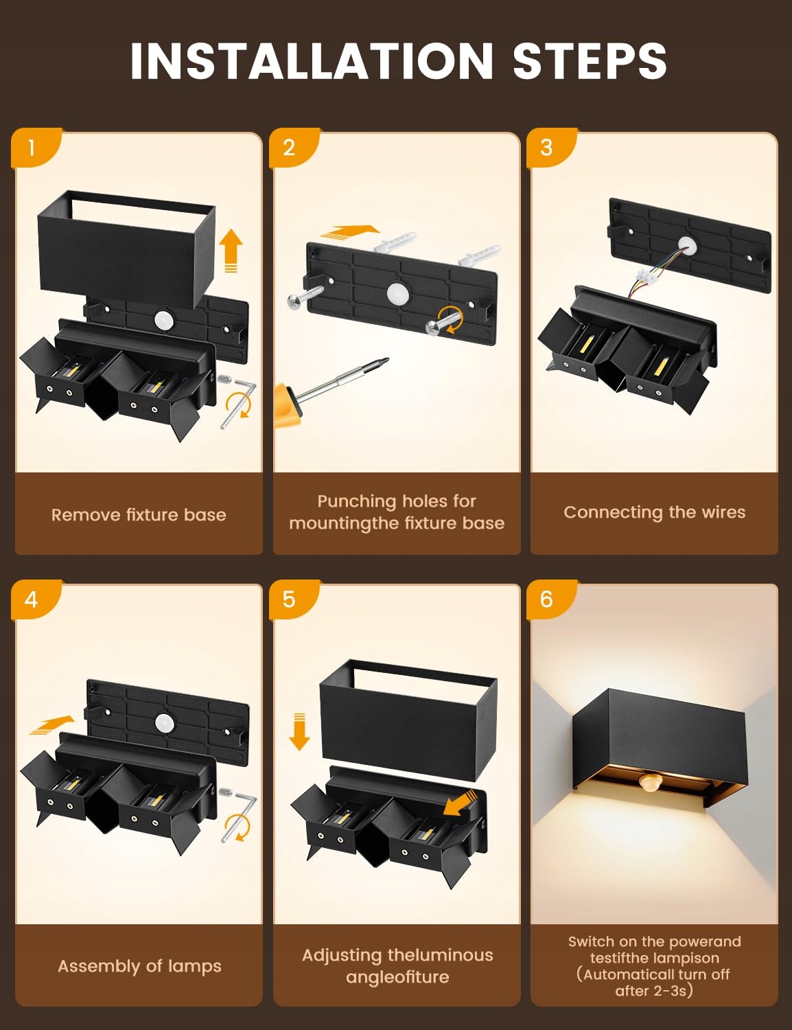 LED kinkiet wewnętrzny/zewnętrzny: LED lampa zewnętrzna z czujnikiem ruchu może być montowana na zewnątrz, np. w parkach, ogrodach, korytarzach i klatkach schodowych. Nadaje się również do wnętrz, takich jak salon, sypialnia i balkony. Dzięki dołączonemu zestawowi narzędzi i materiałom można ją łatwo zamontować na ścianach