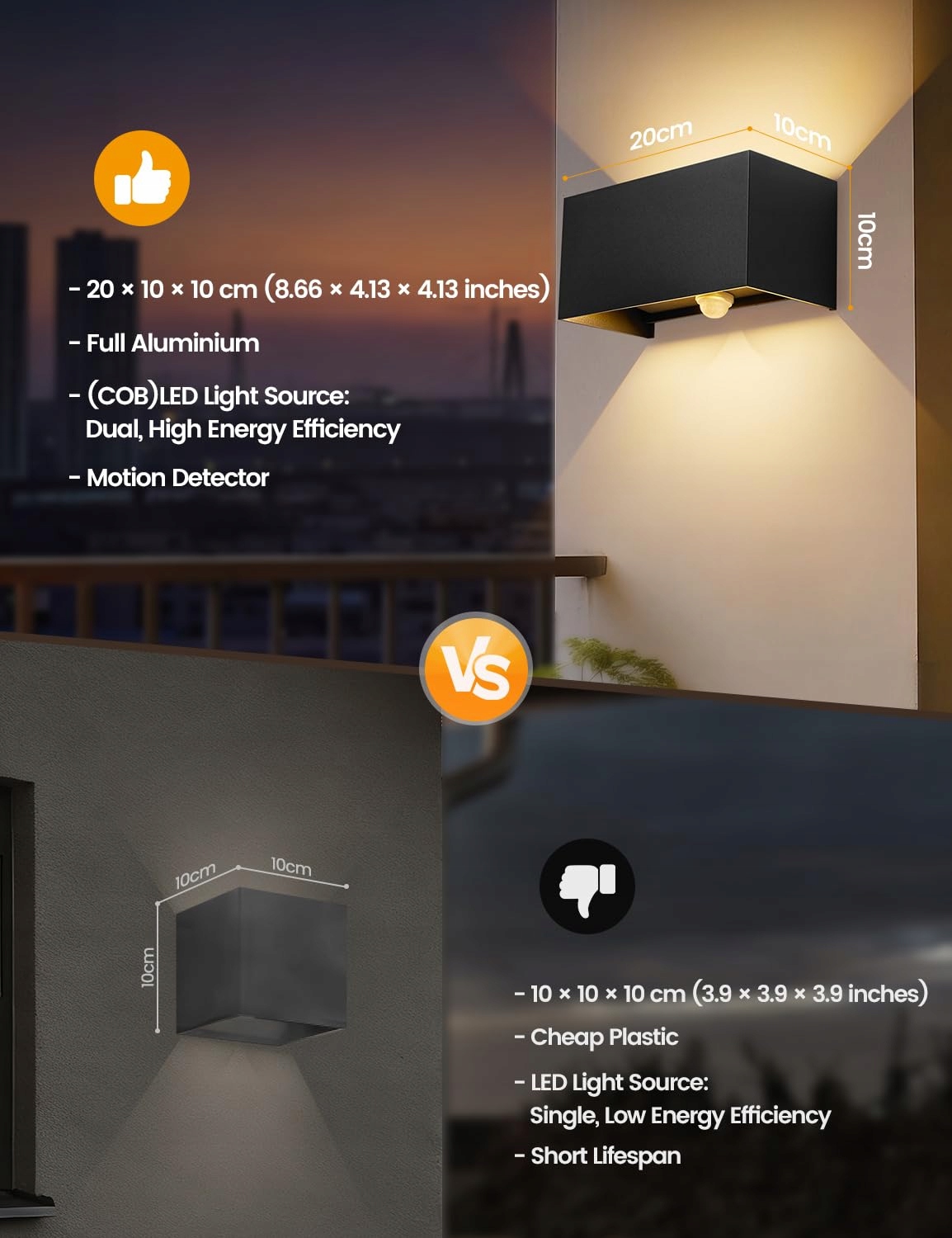 Wodoszczelny kinkiet zewnętrzny IP66: LED kinkiet z czujnikiem ruchu z obudową z wysokiej jakości odlewu aluminiowego jest solidny i trwały oraz zapewnia doskonałą odporność na nacisk i korozję. Lampa posiada pierścień uszczelniający, który skutecznie zapobiega przedostawaniu się wody deszczowej lub kurzu do wnętrza lampy, zapewniając zawsze stałe, doskonałe oświetlenie