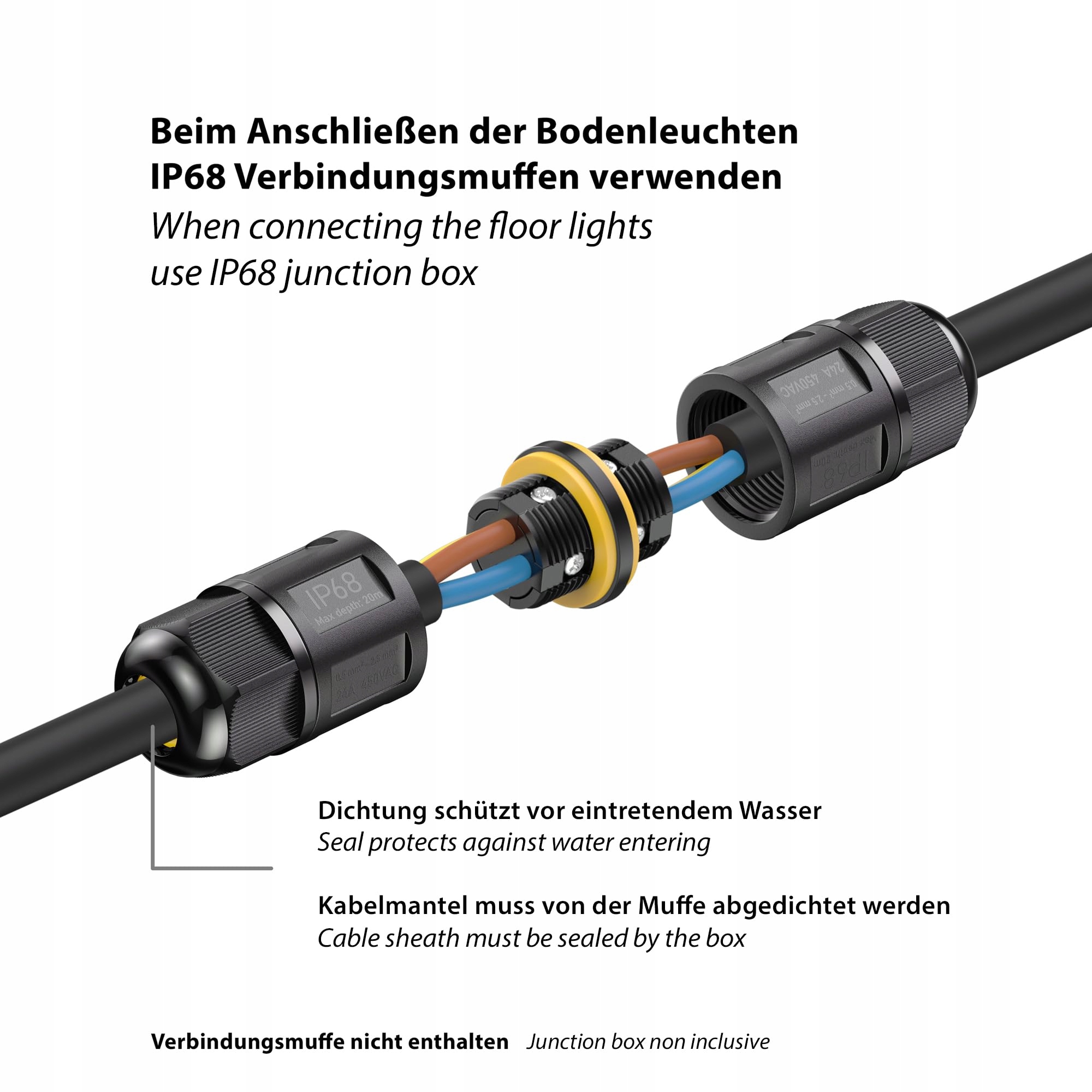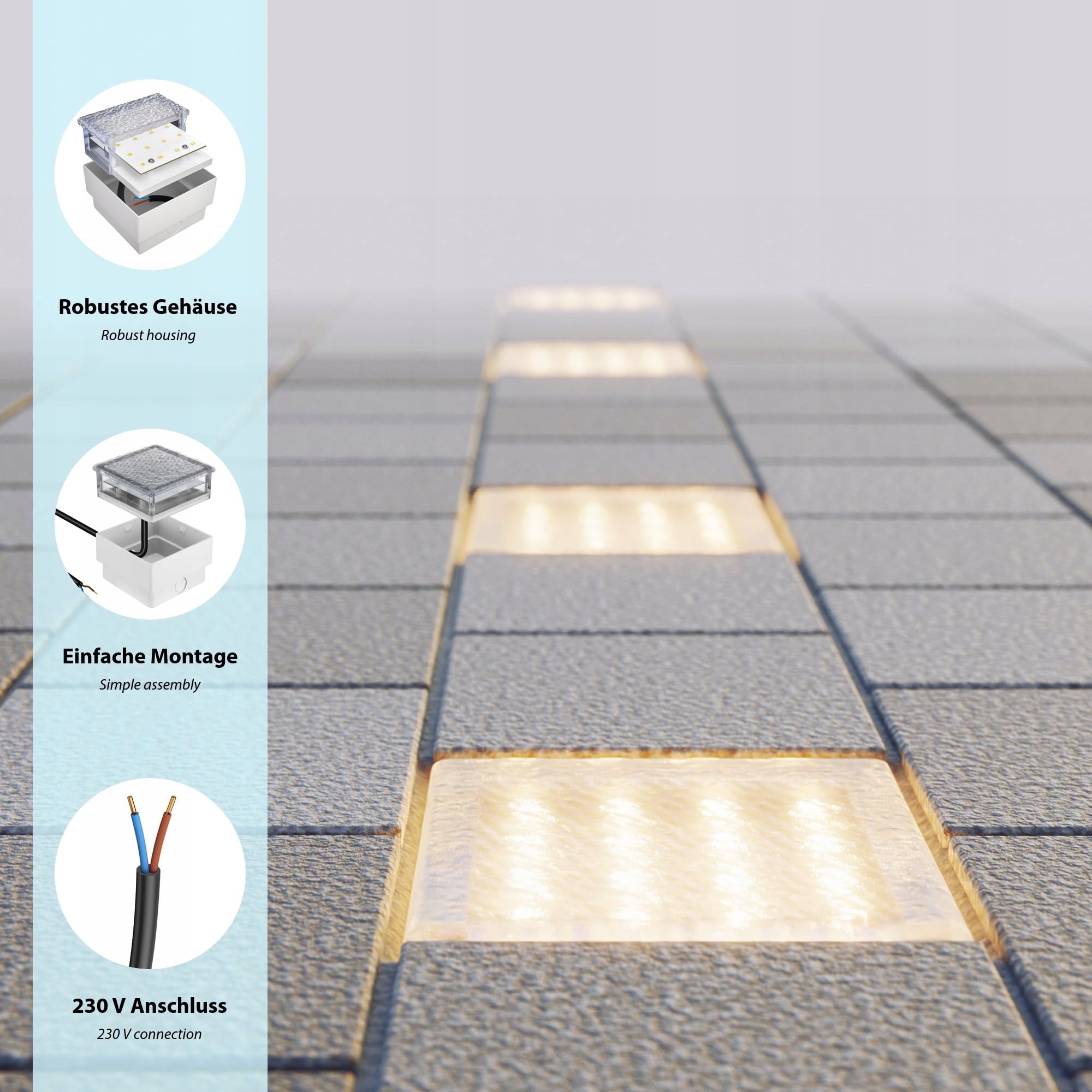 [Stopień ochrony IP67] - Lampa do zabudowy w podłożu to idealne rozwiązanie do oświetlenia zewnętrznego. Solidna obudowa z tworzywa sztucznego chroni LED kostkę brukową przed czasowym zanurzeniem w wodzie i jest całkowicie pyłoszczelna. Dzięki temu jest optymalnie zabezpieczona przed wpływem warunków atmosferycznych w różnych porach roku. Należy pamiętać, że kabel przyłączeniowy musi być koniecznie połączony z mufą przyłączeniową IP68, aby zapewnić szczelność.