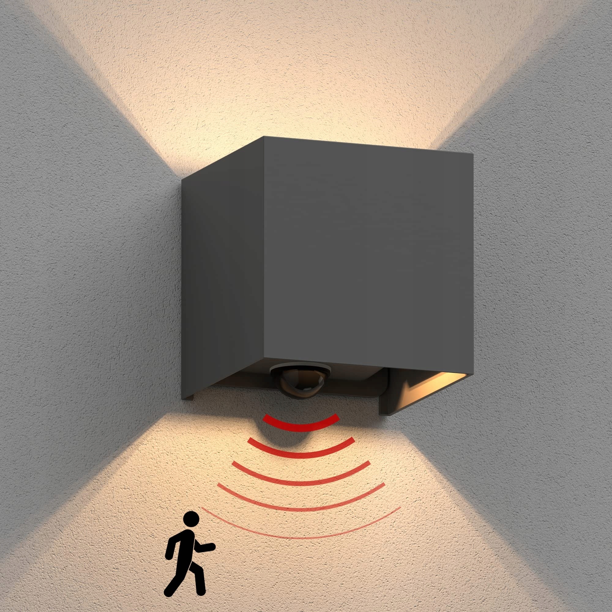[Czujnik ruchu PIR] - Lampa elewacyjna włącza się automatycznie w ciemnym otoczeniu, gdy czujnik wykryje ruch (zasięg: 8-10 metrów, czas świecenia: ok. 1 minuta). Automatyczne włączanie i wyłączanie nie tylko poprawia oświetlenie przestrzeni zewnętrznej, ale także pozwala oszczędzać energię.