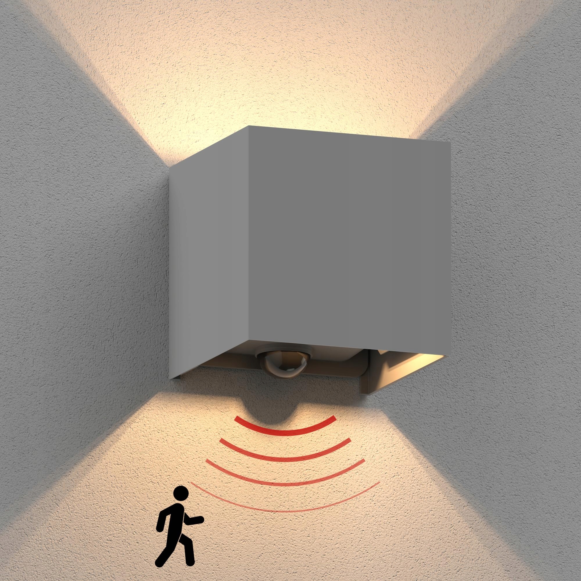 ledscomde Kinkiet CUBEL do użytku zewnętrznego, IP65, światło górne/dolne, czujnik ruchu, matowy szary, kwadratowy, 1x G9 max. 10W