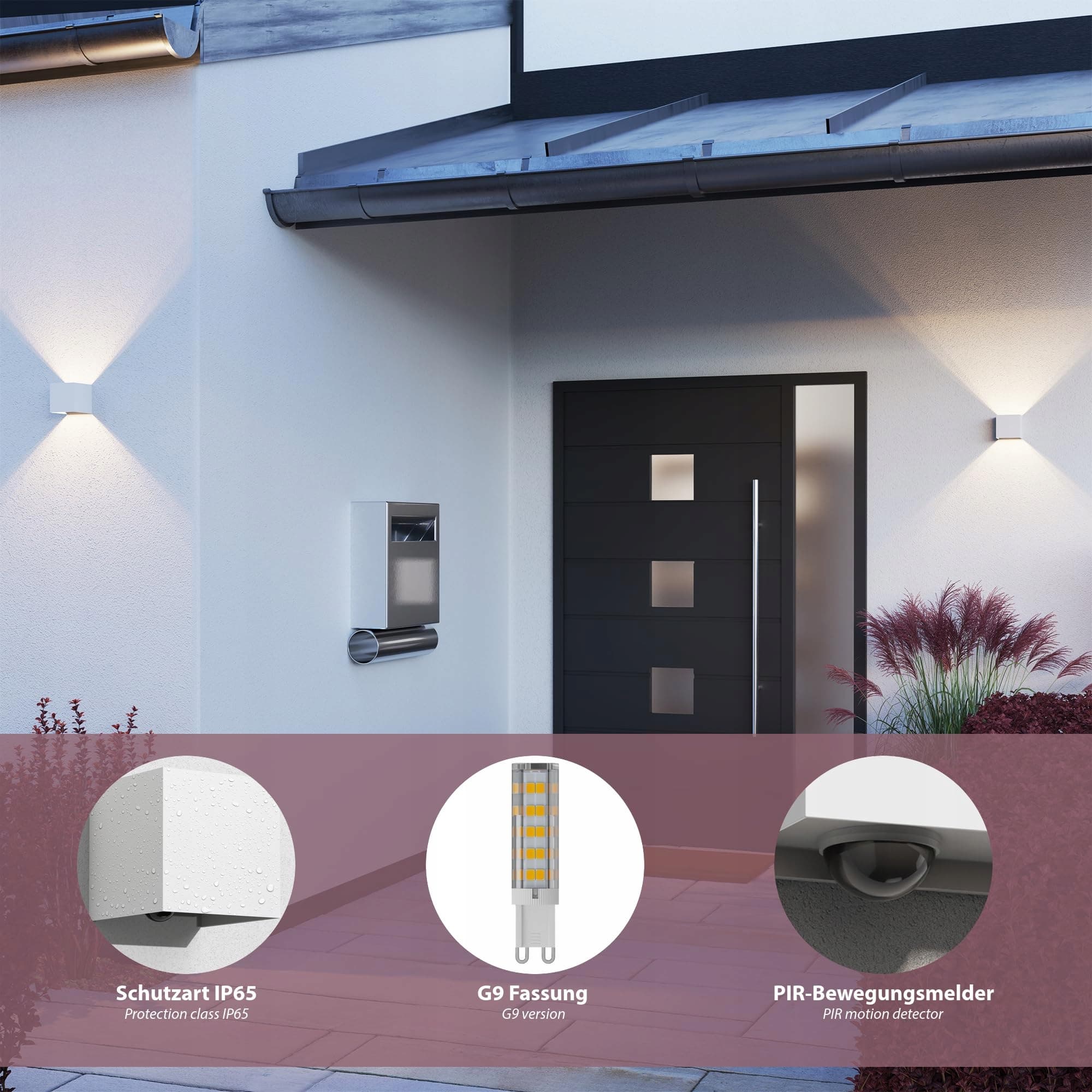 ledscomde Kinkiet CUBEL do użytku zewnętrznego, IP65, światło w górę/dół, czujnik ruchu, biały matowy, kwadratowy, 1x G9 max. 10W