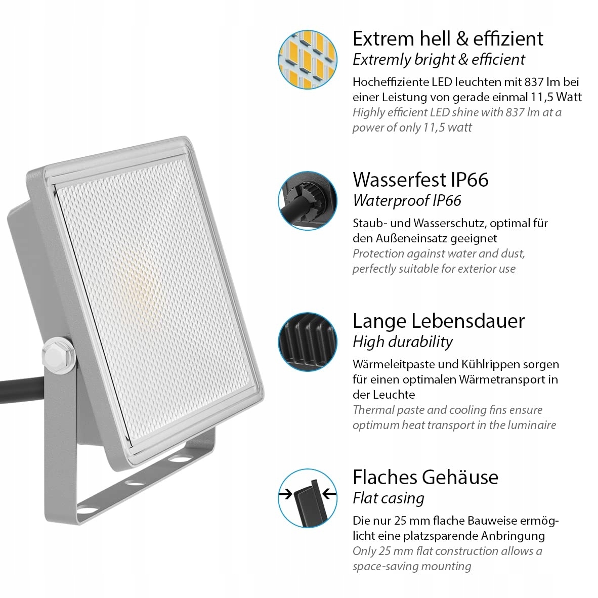 [Szczególnie jasne oświetlenie] - Wysoce wydajny reflektor LED FLIN generuje doskonałą jasność (837 lm przy zużyciu energii zaledwie 11,5 W) i umożliwia efektowne oświetlenie na zewnątrz, np. przy garażu, na podjeździe, w ogrodzie i na ścianie domu.